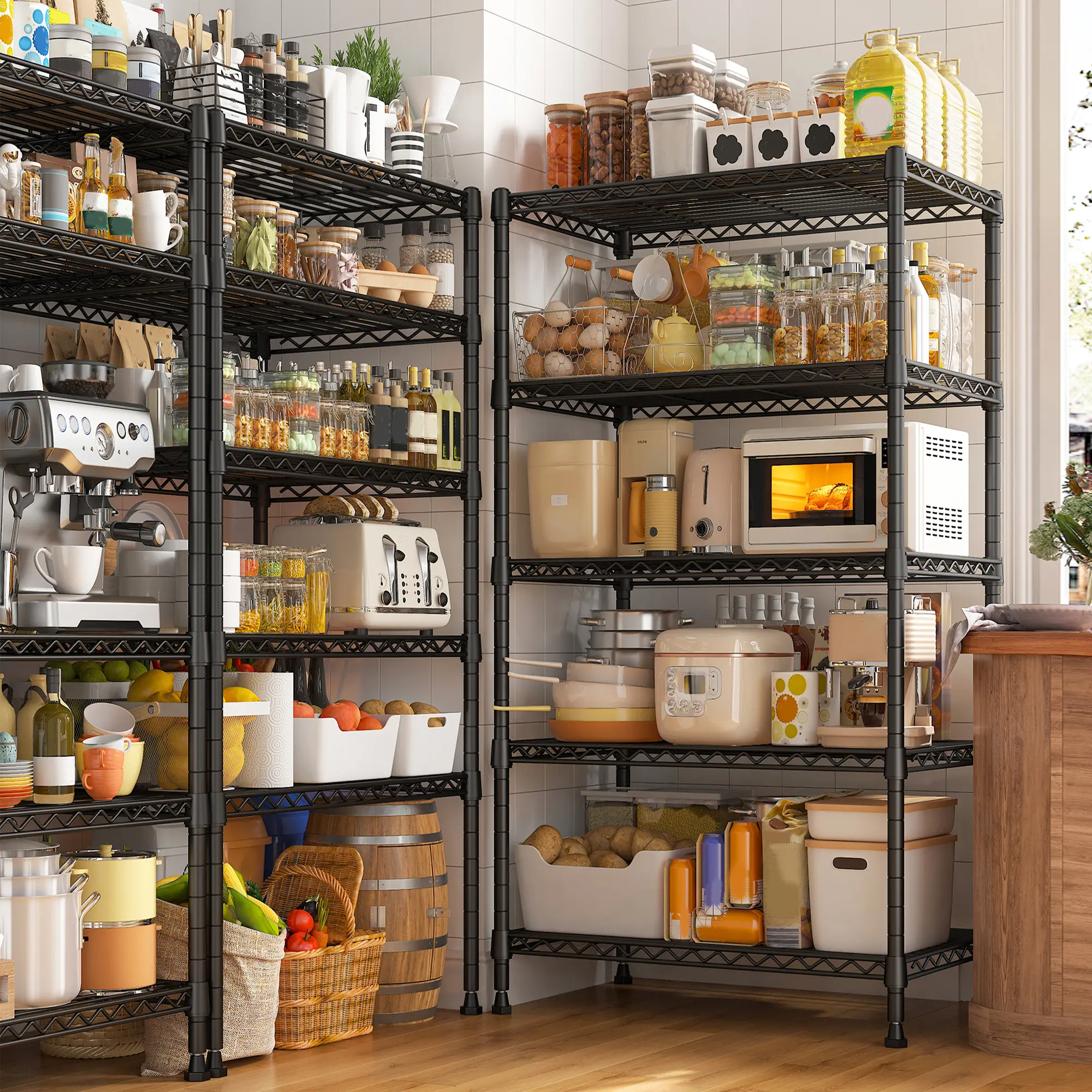 Multifunctional & Adjustable Garage Shelving Adjust the height of each layer with high-quality clips to fit heavy-duty items. Perfect for kitchen, living room, bathroom, garage, etc.