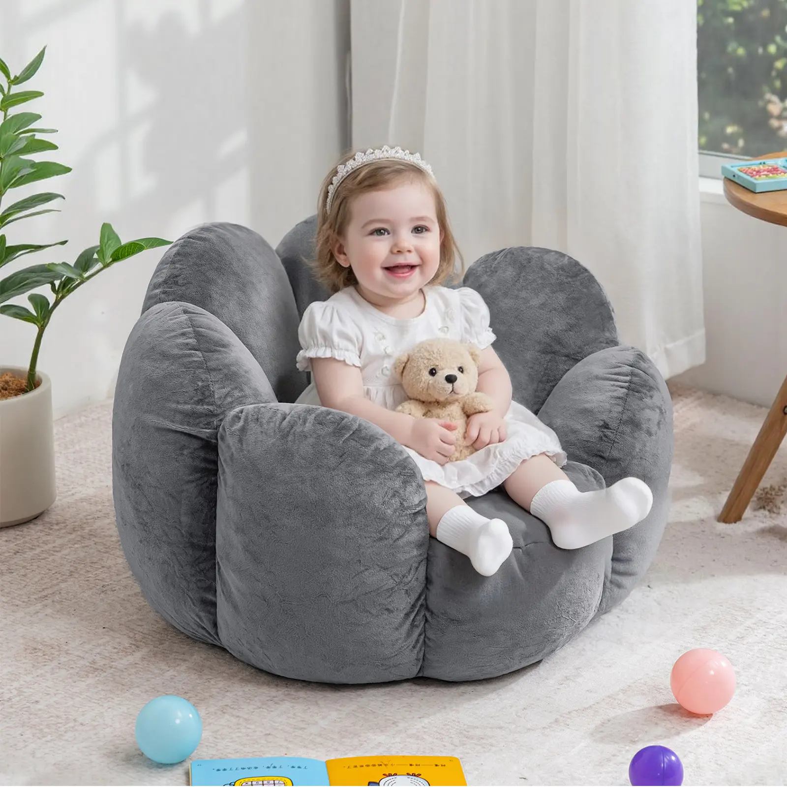 HOMMPA Kids Bean Bag Chair Flower Shape Bean Bag Sofa Comfy Velvet Bean Bag Chair for Kids Boys and Girls Baby Lazy Floor Sofa Chair for Gaming Reading Playing Grey