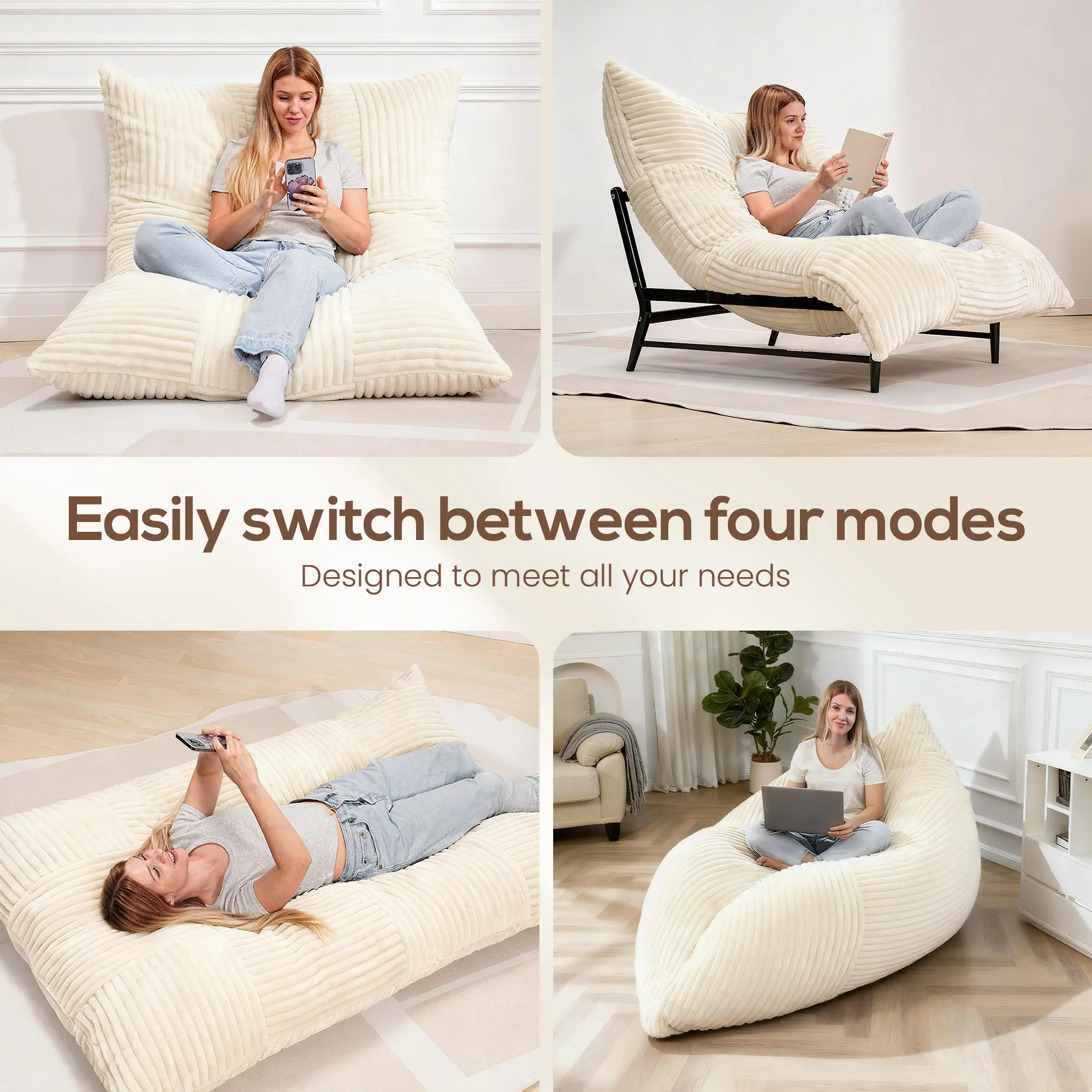 ·4 in 1 Oversize Sofa Chair:Ideal for living rooms, bedrooms, dorms, or lounges. Works great as a floor sofa, recliner, sofa bed, or bean bag couch—blending easily into modern or casual home décor.