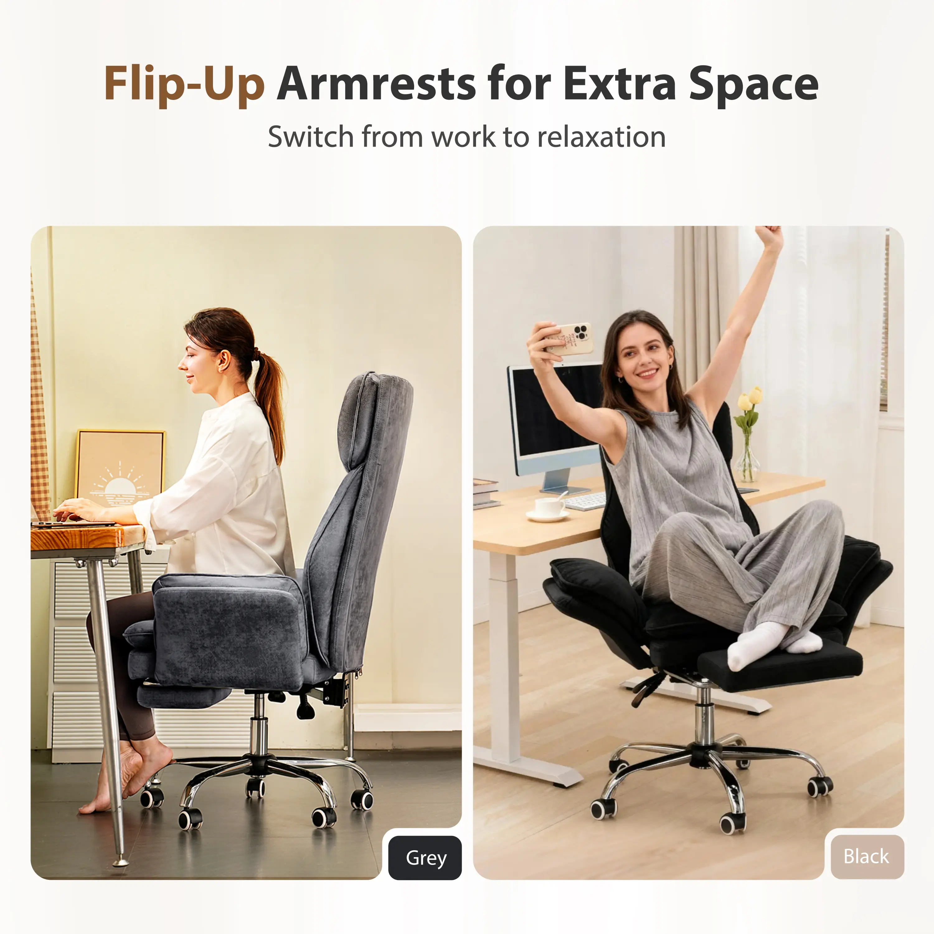 ¡Focus Mode: Lock armrests upright for desk work.