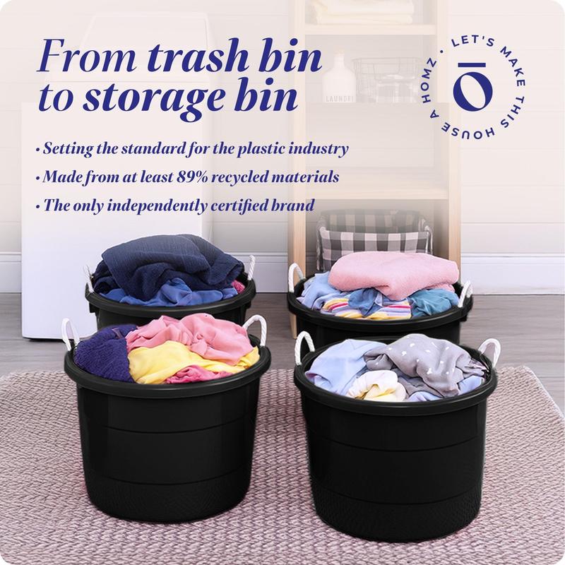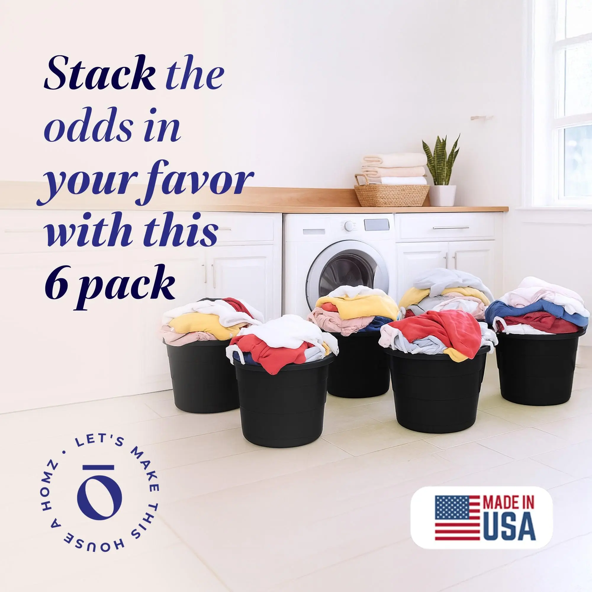 When you want a versatile storage container for around the house, look to the 2 pack of Homz 18-Gallon Plastic Utility Tub 6-Pack. These plastic storage tubs are great for storing items around the house and garage, as well as for indoor and outdoor storage.Stash toys inside the plastic tubs or use them as a laundry basket. You can even use this large plastic tub as an ice cooler for outdoor parties and get-togethers. With 18 gallons of space inside, you can use each storage container for just about anything. Overall, the plastic storage buckets measure 21.5 inches in diameter and 16.5 inches tall.The durable plastic makes these storage buckets great for indoor and outdoor use season after season. Easily carry the buckets around with the comforting nylon rope handles. When you're not using the storage bucket, you can nest other buckets inside for compact, efficient storage.Keep items neatly stored anywhere and enjoy a more organized household with the 2 pack of 18-Gallon Plastic Utility Tubs 6-Pack from Homz.