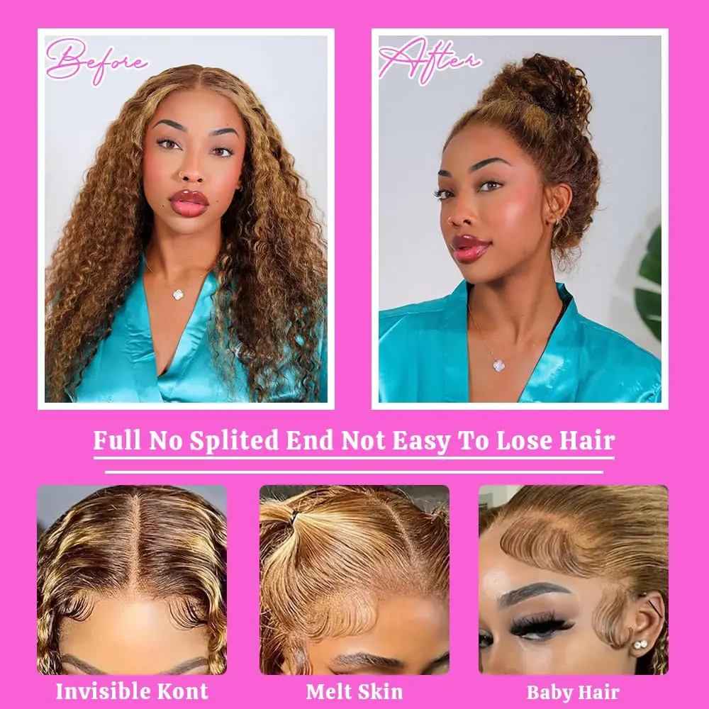 ·Honey Blonde Deep Wave Glueless Lace Frontal Wigs Leave More Space Make Free Part/Middle/Side Part. 360 Full Lace Wigs Can Change the Style Easily, Make Ponytail and Bun Suitable for Any Occasion.