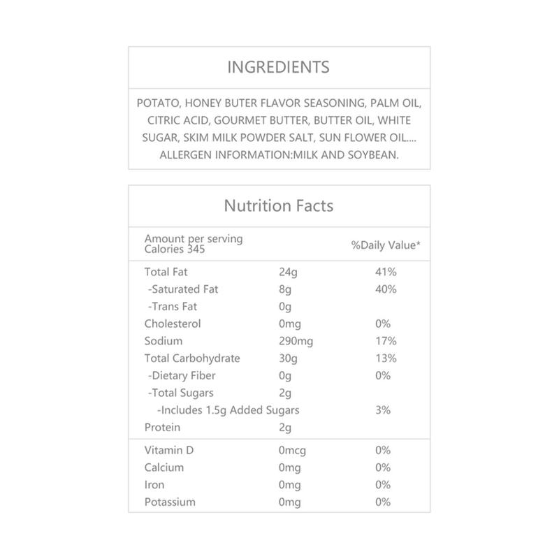 ·Potato,Mixed Edible Oil (Palm Olein Oil, Hig Oleic Sunflower Oil, Other Processed Food (Mixed Tocopherol, Rosemary Extract, Sunflower Oil, Fat-Sluble Greentea Extract)),Honey Butter Taste Seasoning (Fructose, Sugar, Refined Salt, Skim Milk Powder, Butter Mixture Powder, Yeast Extract Powder, Hydrolyzed Soybean Protein, Whey Powder, Butter Crea Flavor(Vegetable Oil,Decenoic Acid, Delta-Dodecalactone, Decanoic Acid),Silixcon Dioxide, Soy Sauce Powder, potassium Chloride, Natural&Artificial Flavors, Masing Agent(Whey Powder, Butter Vitamin E),Lactic Acid Powder, Parsley Flake, Honey Powder, 5'Ribonucleotide, Butter Flavor, Butter, Citric Acid,Malic Acid, Sucralose, Glucose.