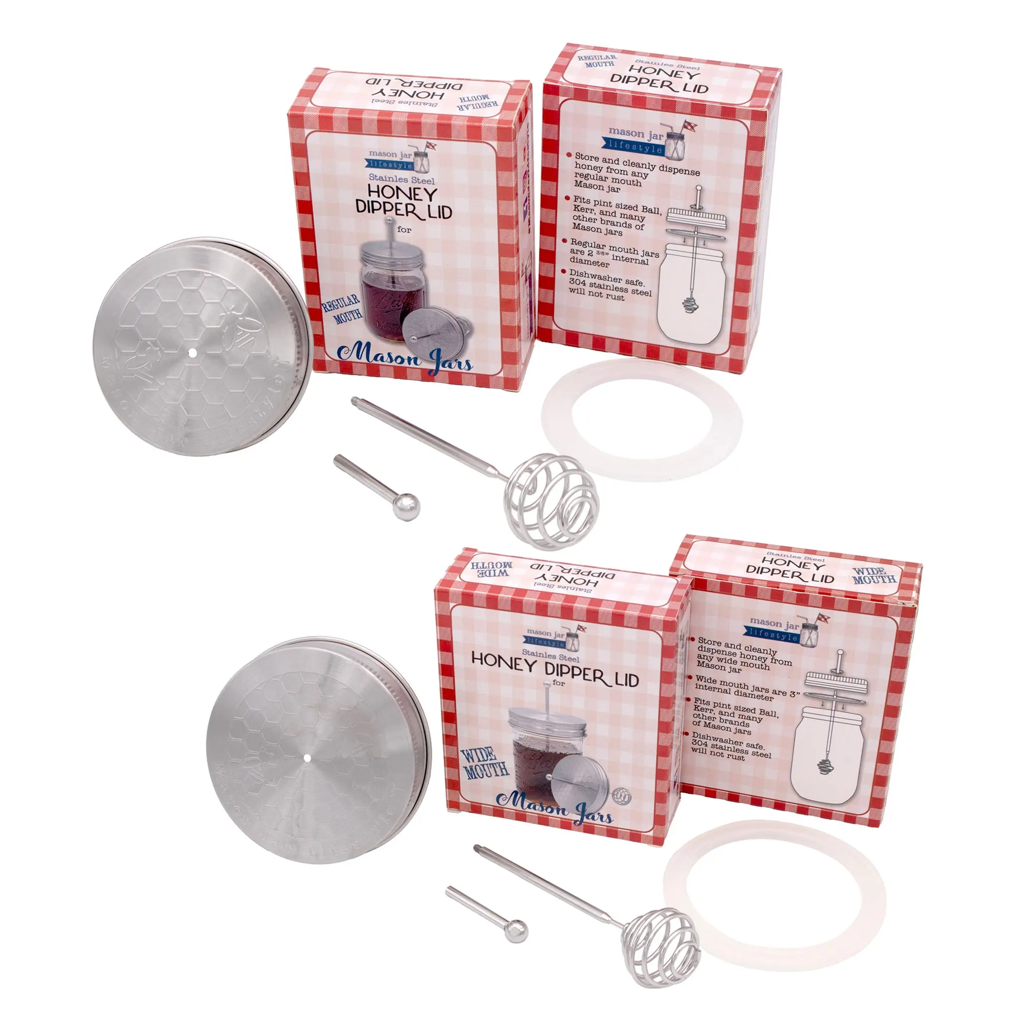 The Stainless Steel Honey Dipper Lid “honeycomb” part of the wand dispenses the honey evenly and does not make a mess. I like that the lid can be purchased for either regular or wide mouth jars. The lid is cute and I like that it’s all stainless steel.