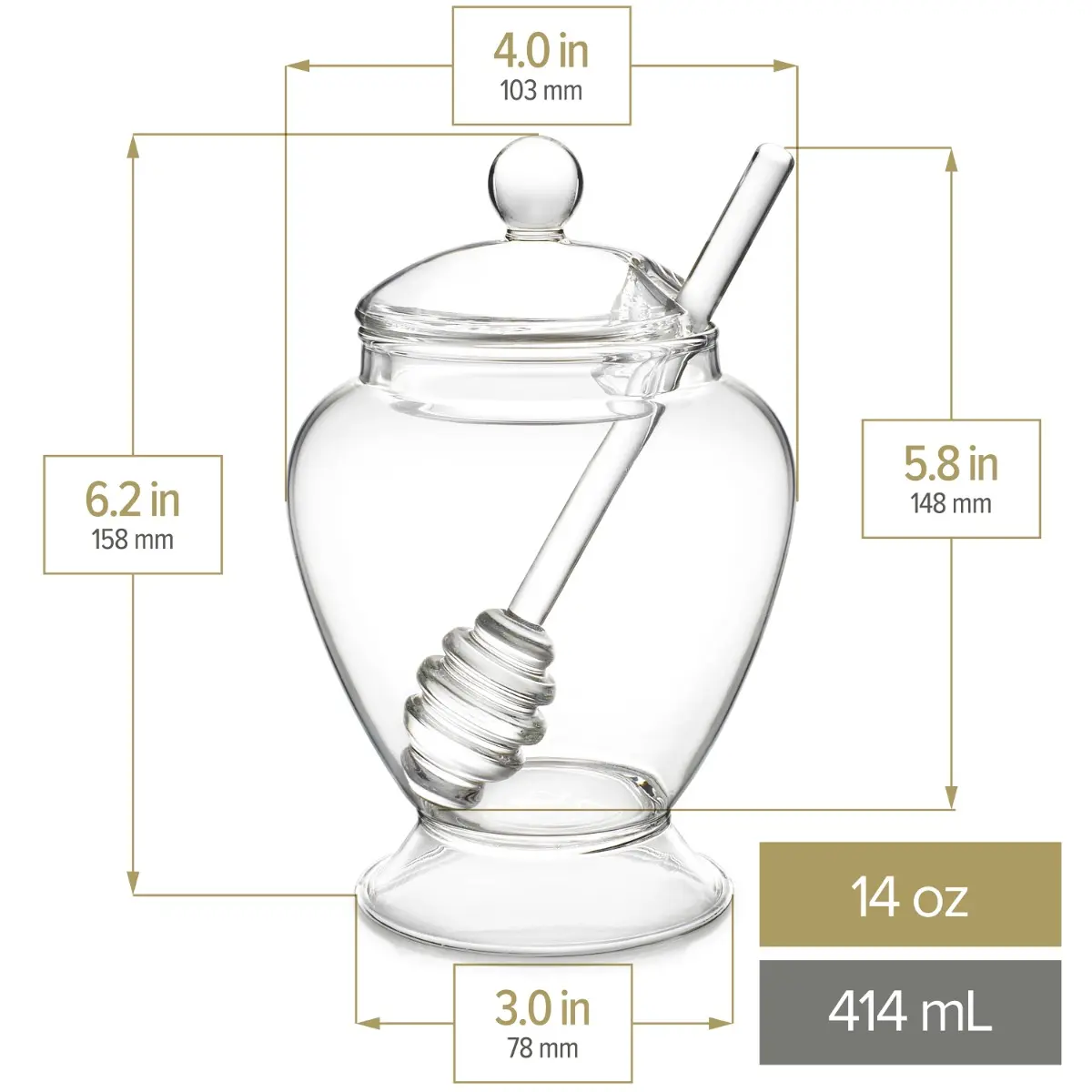 The Three-piece set includes a jar with dipper and lid. All pieces are made of safe lead-free and cadmium-free borosilicate glass.