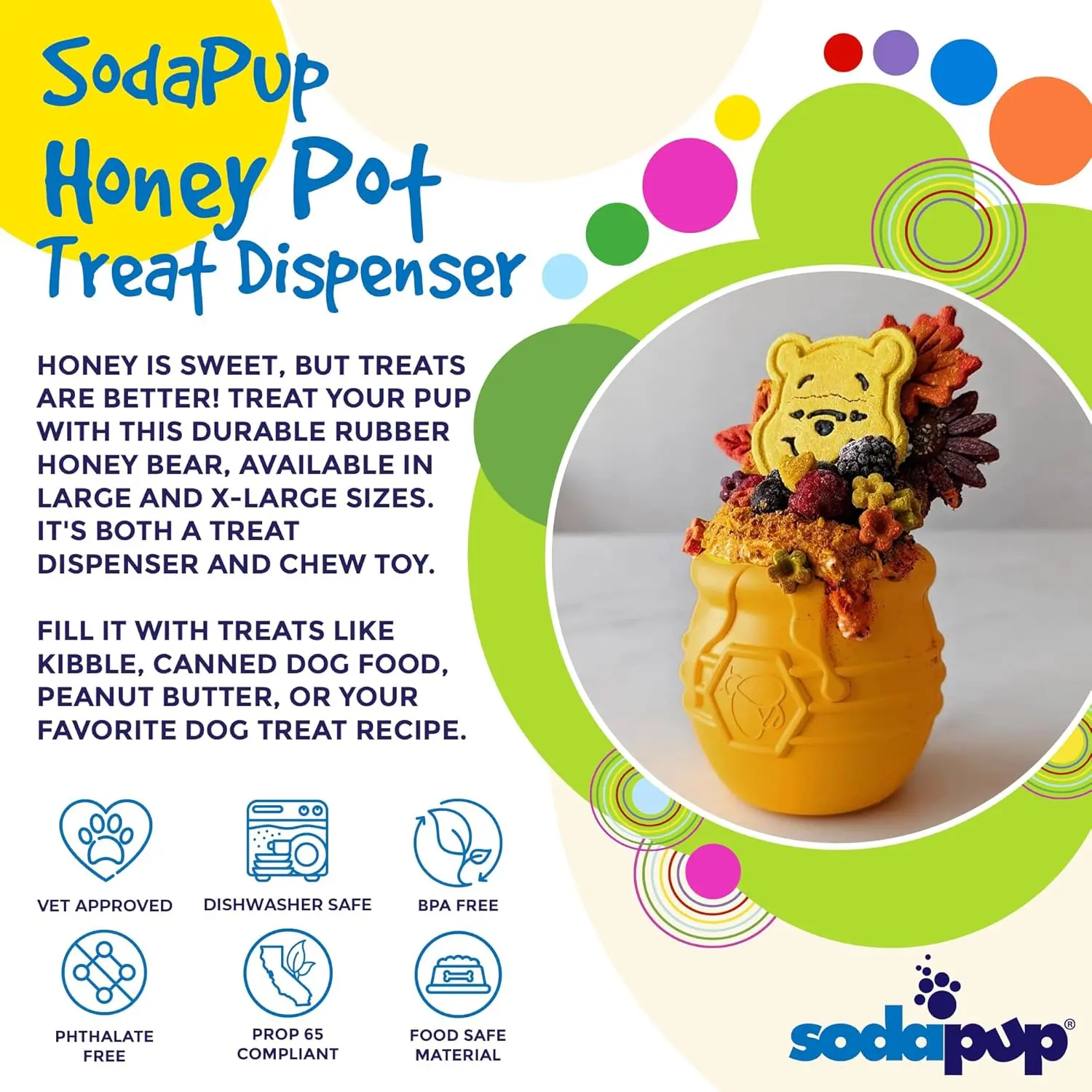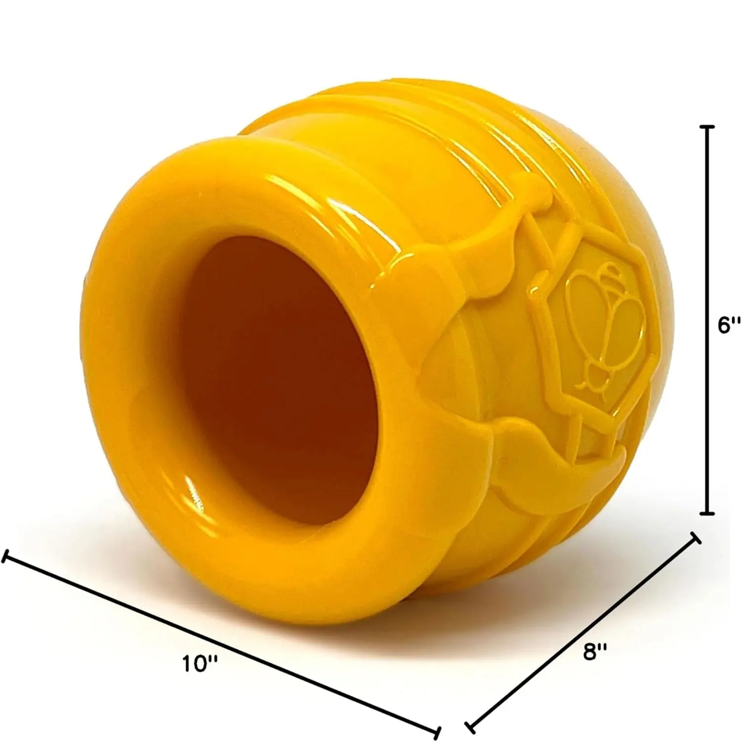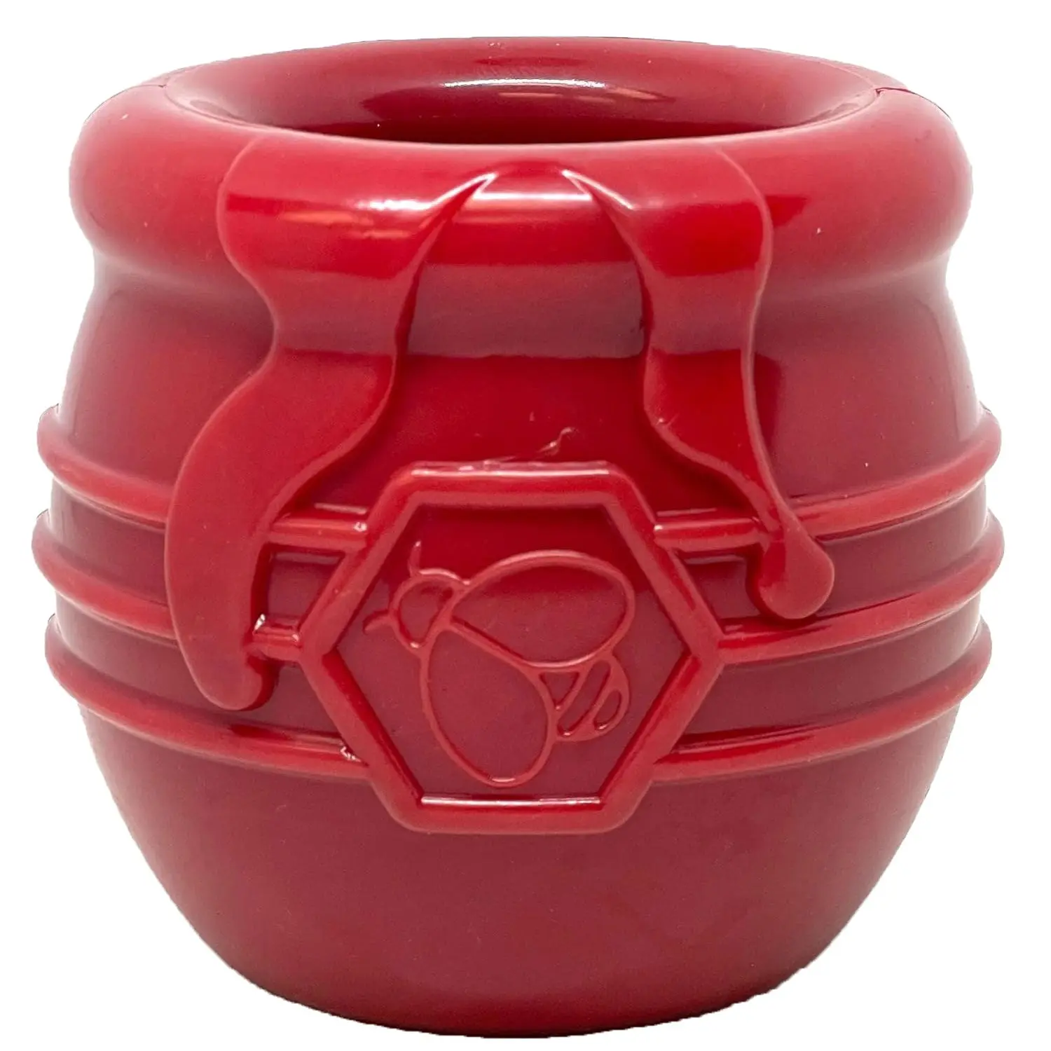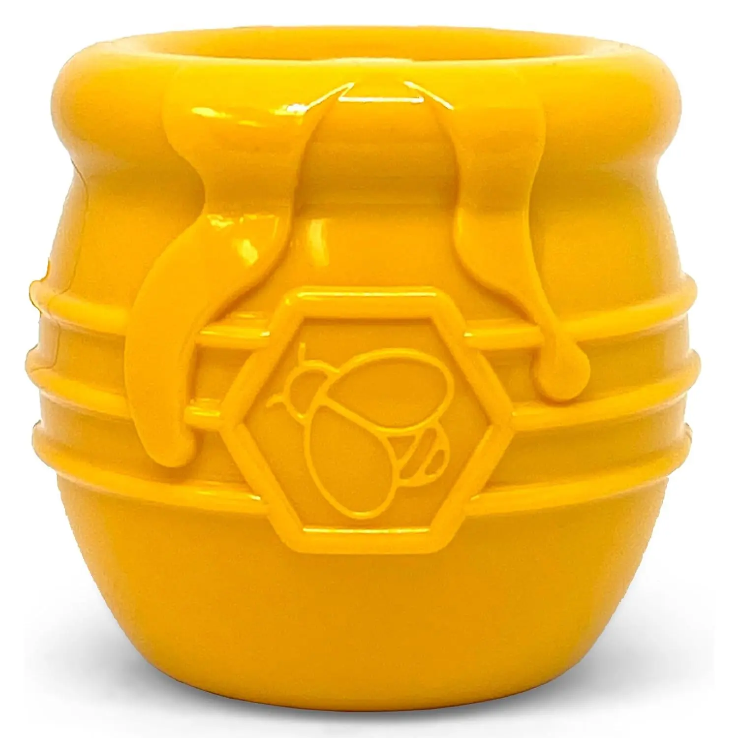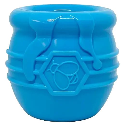 SodaPup Honey Pot Durable Rubber Treat Dispenser - We've gotten a lot of design inspiration from the humble bumble bee over the years, creating honeycomb mats, honey stick chew bones, and honey bear treat dispensers. Now, we complete our honey-inspired collection with a honey pot! Winnie the Pooh would love it, and so will your dog. This fun treat dispenser can be filled with all foods and frozen treats to increase the feeding challenge.