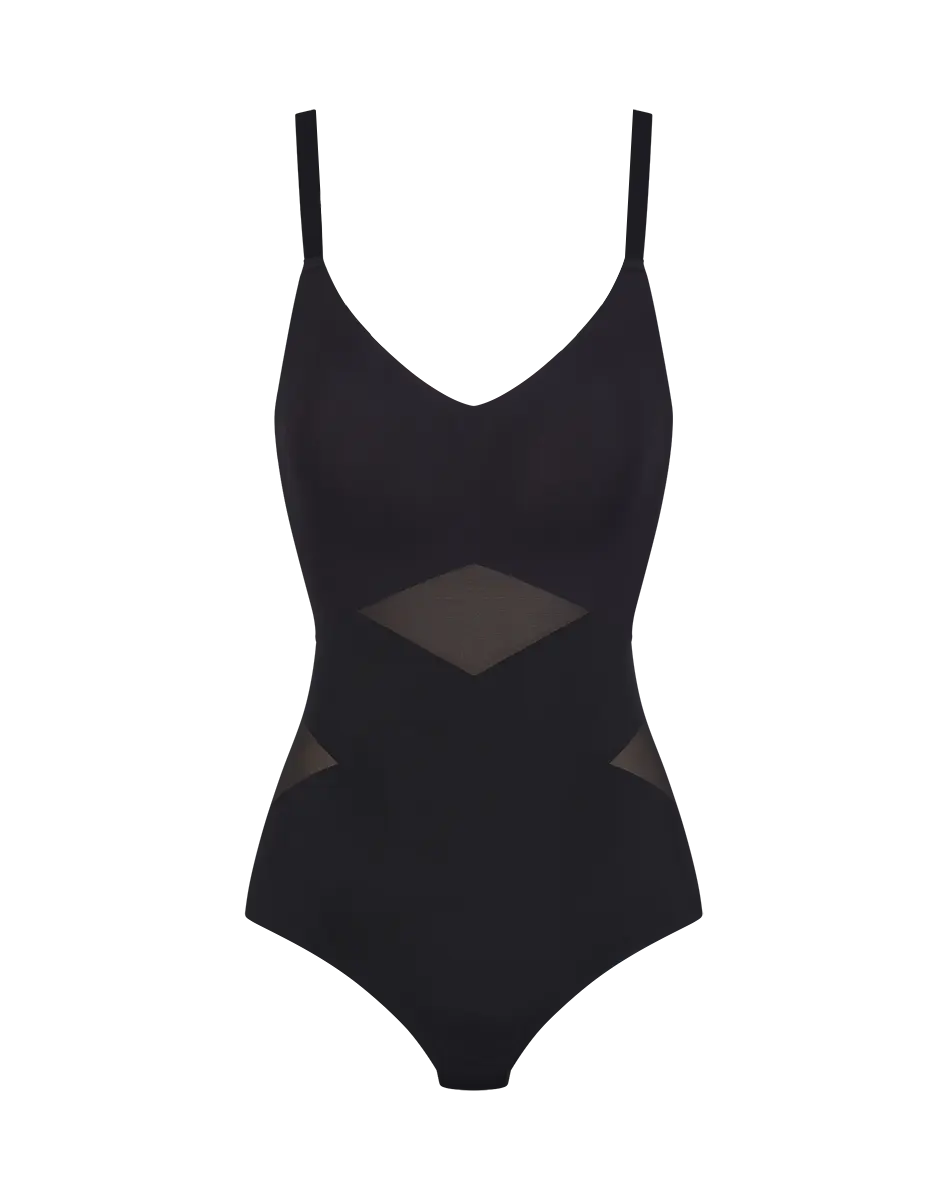 Made with adjustable straps and a thong bottom to prevent panty lines, this shapewear bodysuit is versatile and powerful. Doubleknit compression panels provide targeted sculpting, and bonded panels at the back of the garment provide extra back smoothing. A built-in bra provides excellent lift and support. The bodysuit’s adjustable hook and eye gusset provides easy access when it’s time to use the restroom.