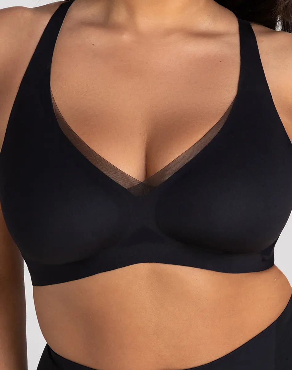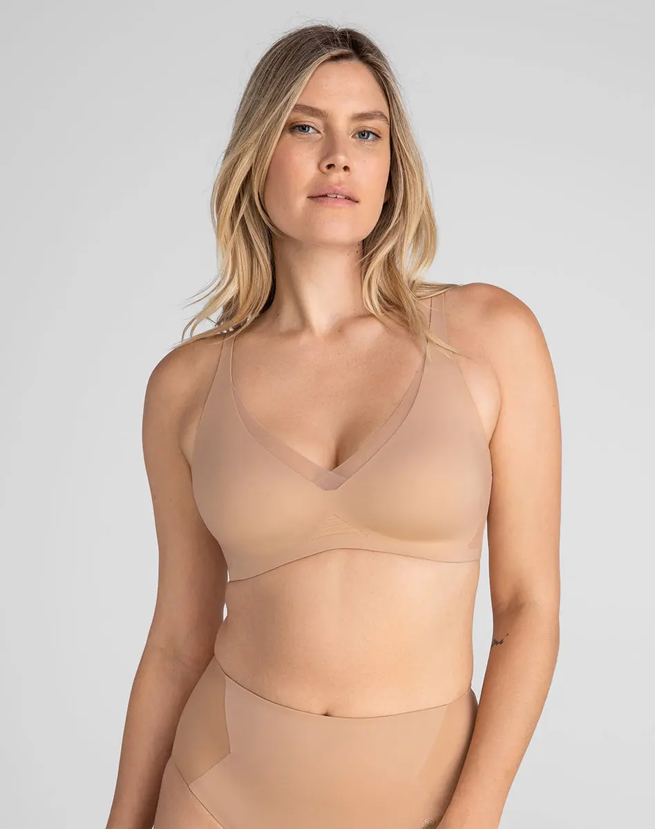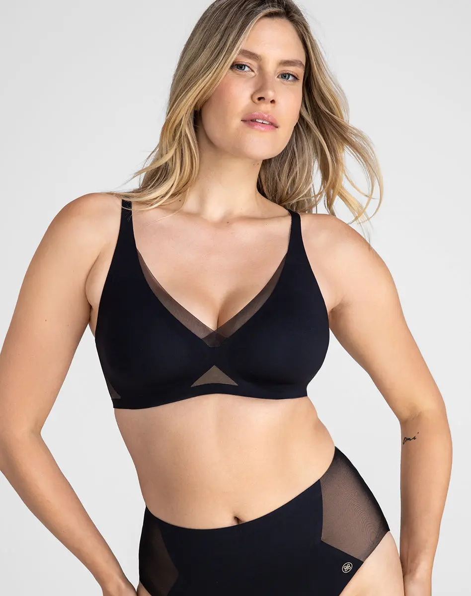 Designed with our signature mesh and a lower-cut neckline, this wire-free bra offers a unique look. The bonded cradle provides lift and support without underwire, ensuring comfort. The smoothing wings refine your shape and eliminate back and arm bulges.