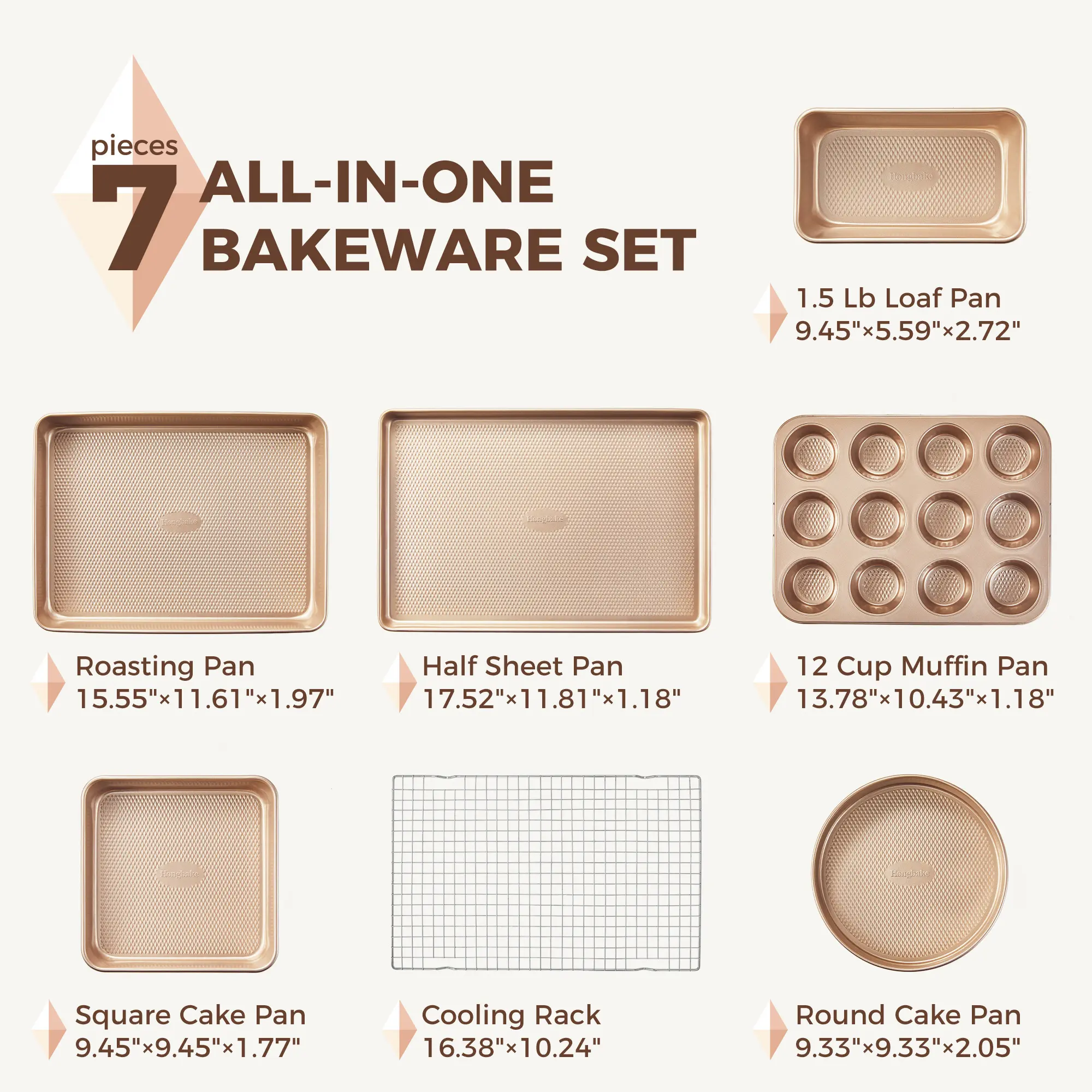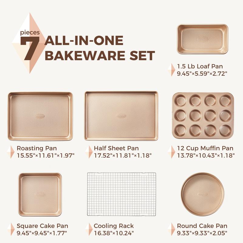 ·7-Piece Set: Perfect for baking, roasting, and more, this complete 7-piece baking pan set is an ideal starter collection for new bakers. It includes a half sheet pan (17.52 * 11.81 *1.18 in) with a cooling rack (16.38 * 10.24 IN), a round pans (9.33 * 9.33 * 2.05 in), 12-cup muffin pan (13.78 * 10.43 * 1.18 in), roasting pan (15.55 * 11.61 * 1.97 in), 1.5 lb loaf pan (9.45 * 5.59 * 2.72 in), square pan (9.45 * 9.45 * 1.77 in).