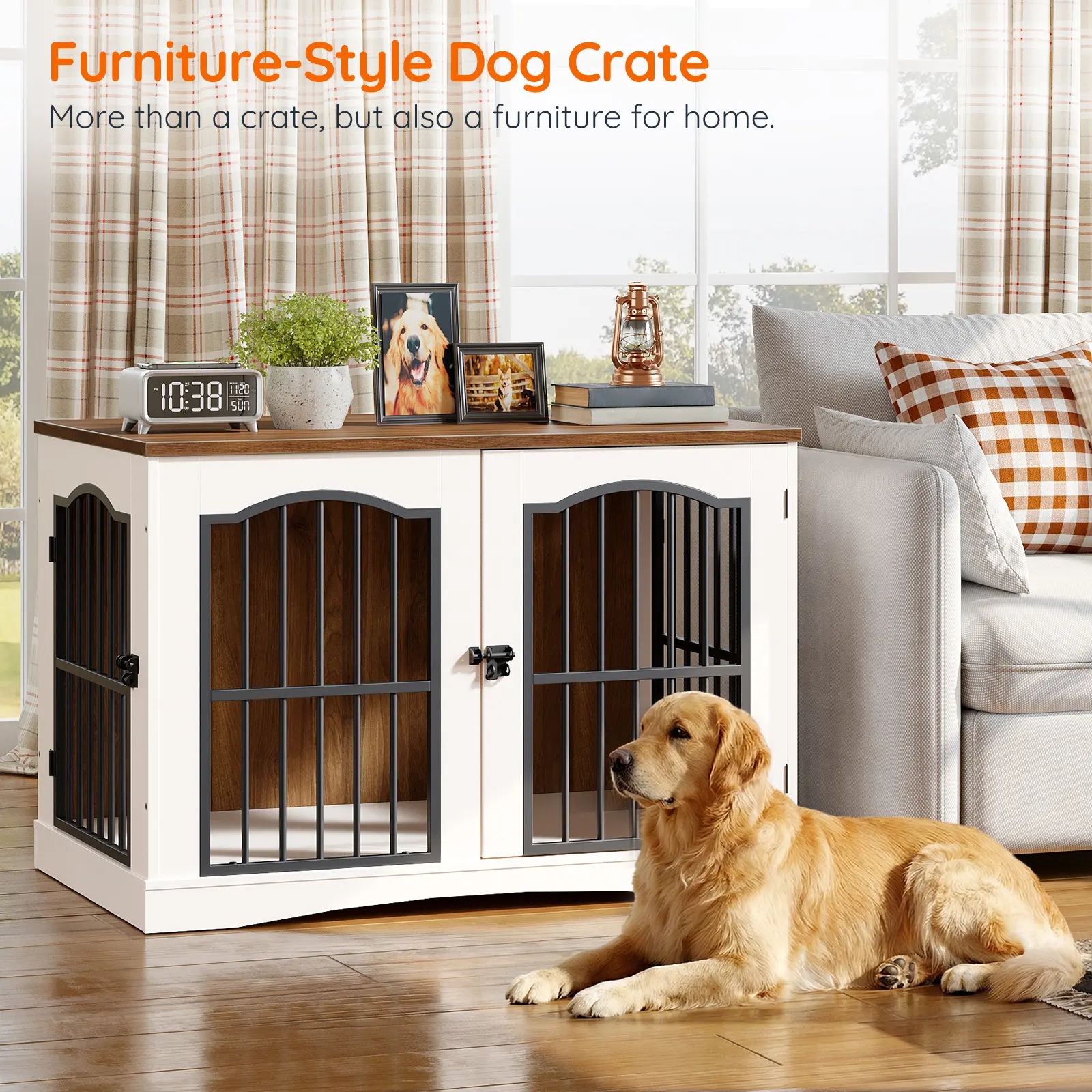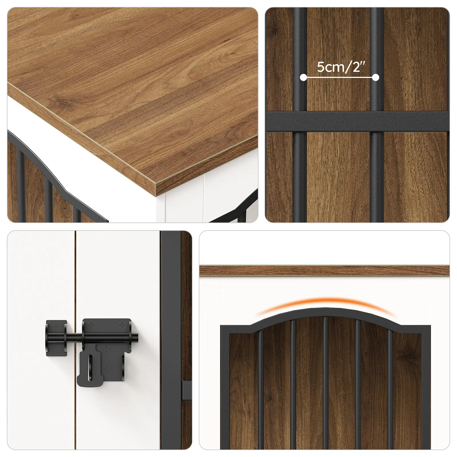 ·Chic Dog Crate Furniture: Featuring a stunning walnut and white color scheme, this stylish dog cage features sleek black metal tube doors with a graceful curved design. Its modern appearance seamlessly fits into your living room or bedroom and enhances your space