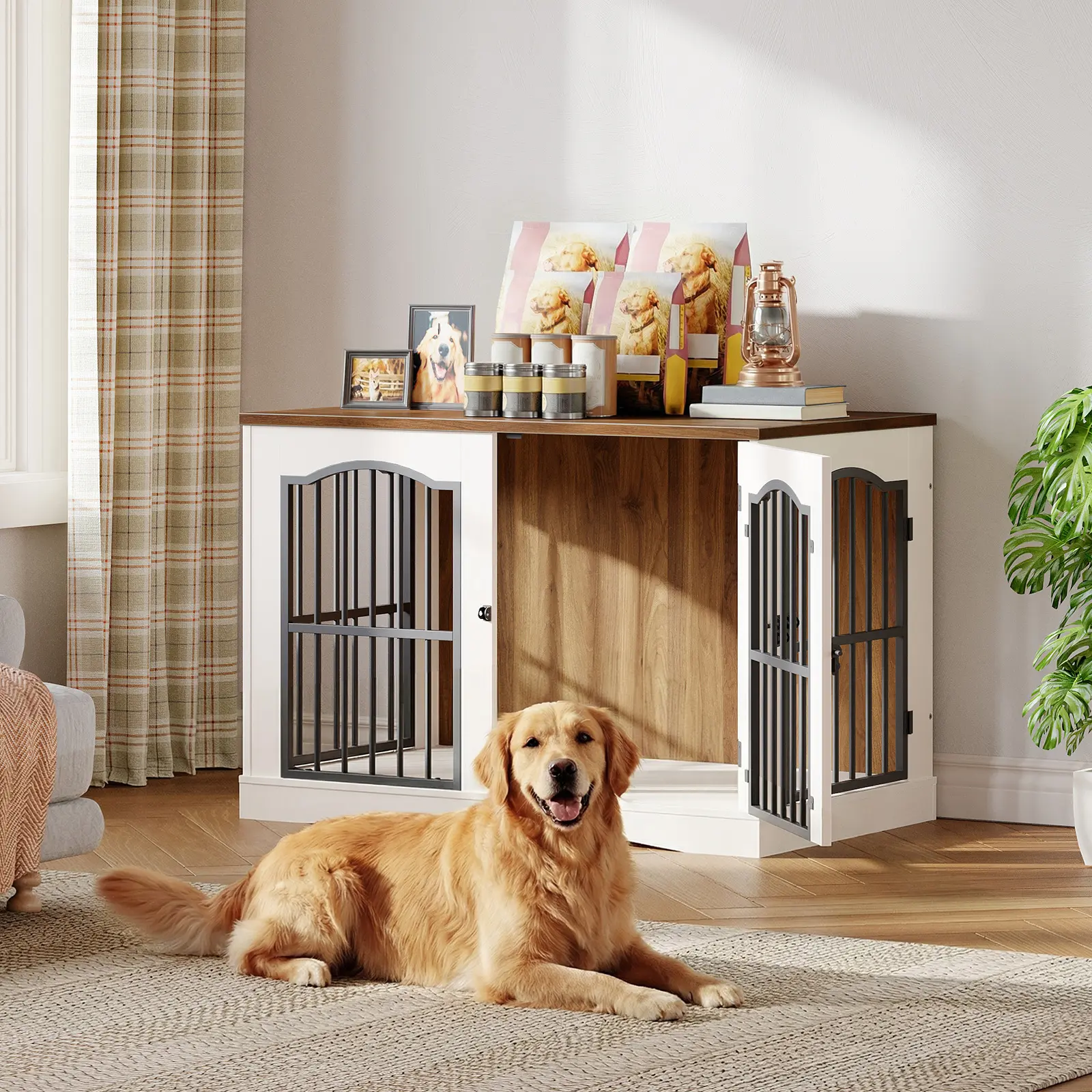·Sturdy Construction: Crafted from reinforced metal pipes and high-quality particleboard, our dog crate furniture is built to with stand wear and tear. A thoughtfully built framework provides a secure environment for your dog, delivering reliable safety and comfort during both rest and play
