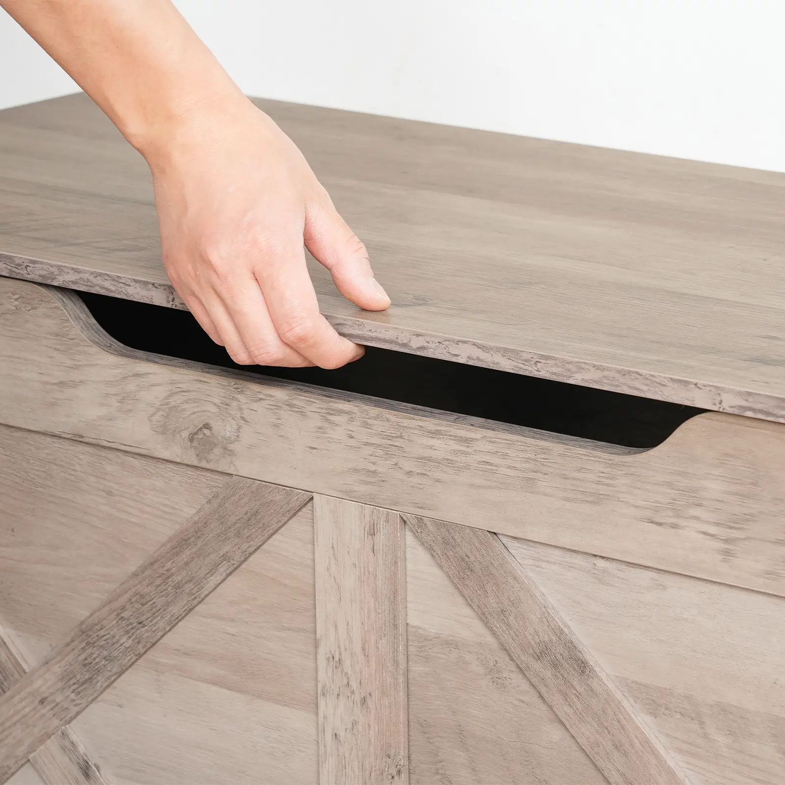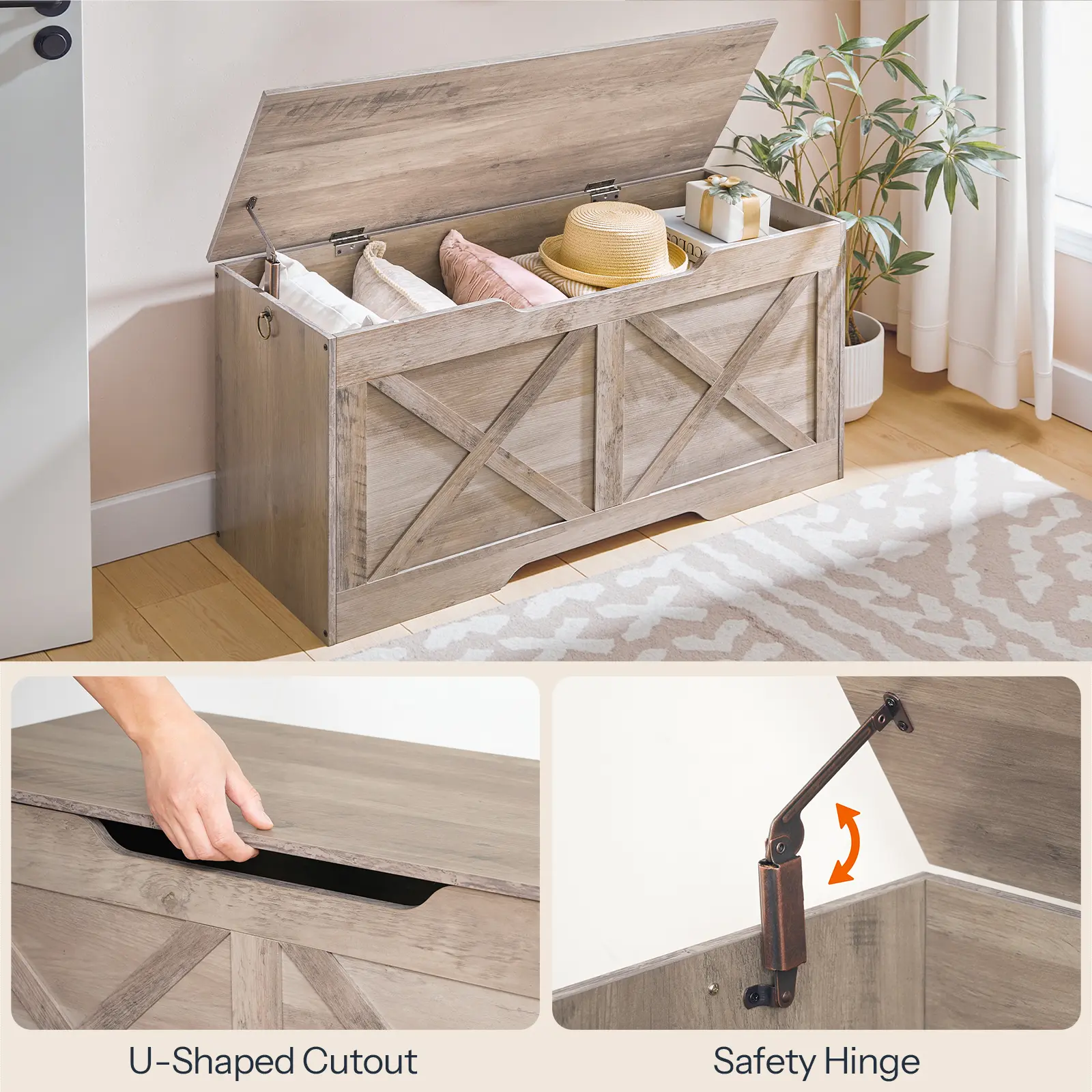 ·Safe and Secure: The storage bench boasts a safety hinge to ensure the lid opens and closes smoothly, preventing accidental closure and pinching. The U-shaped cutout facilitates opening, while side pull rings make it easy to relocate the cabinet as needed