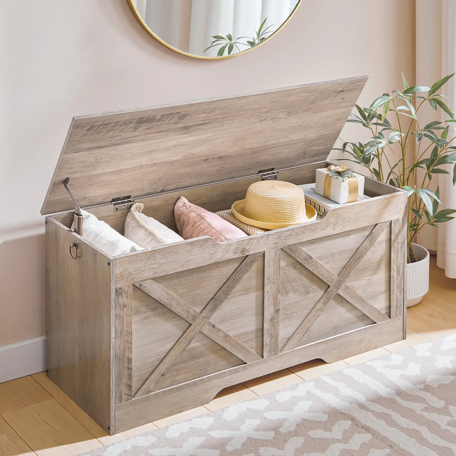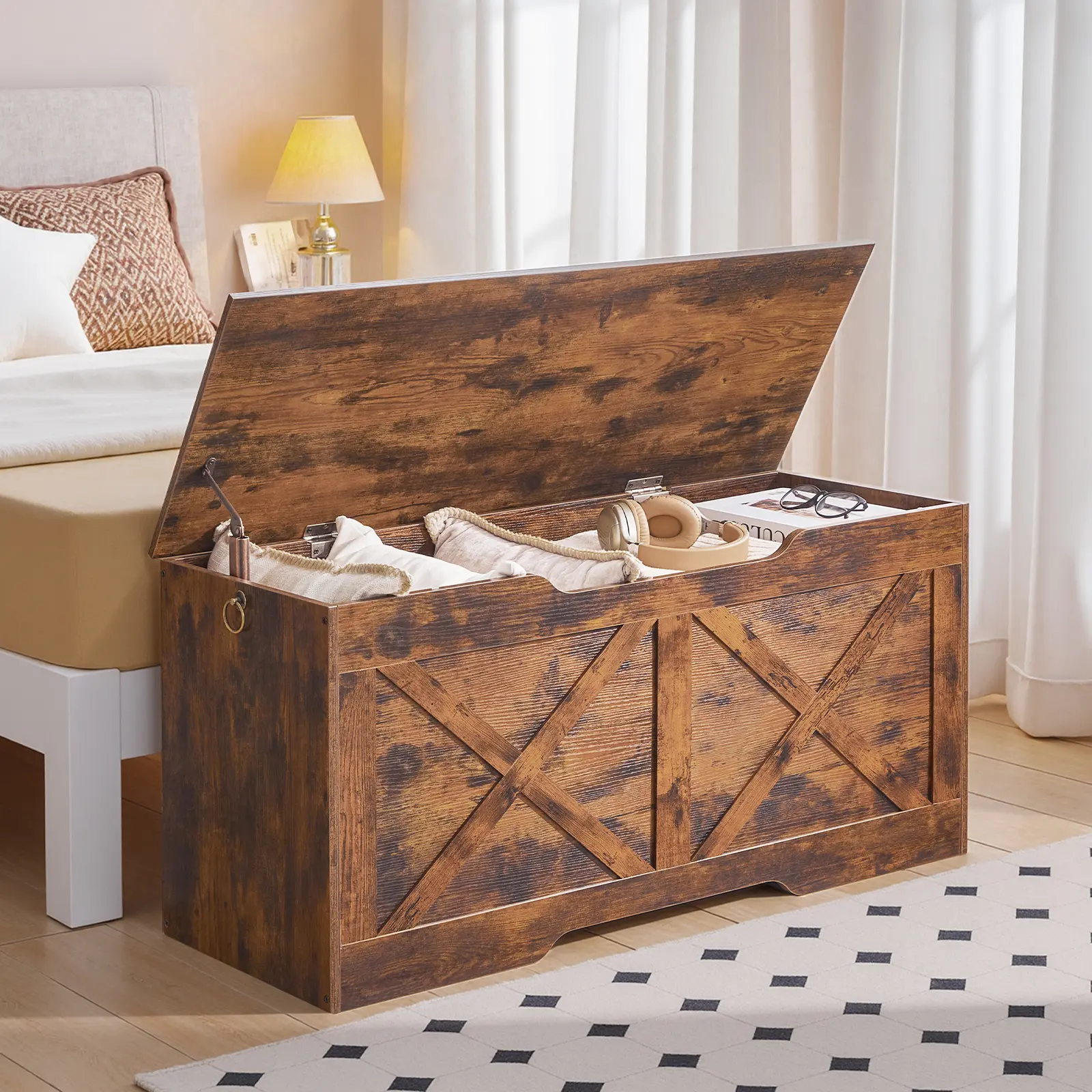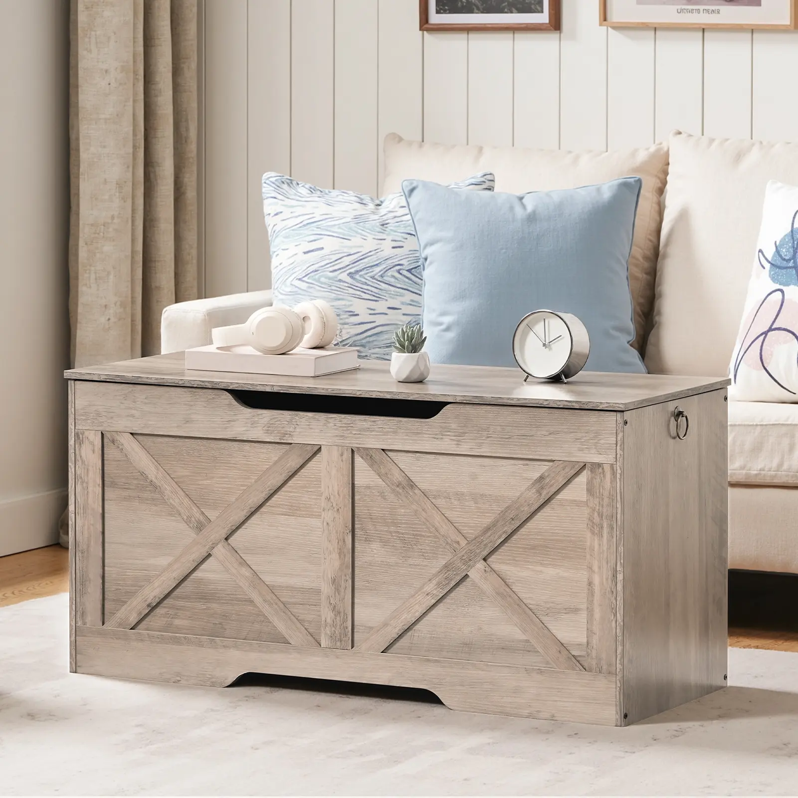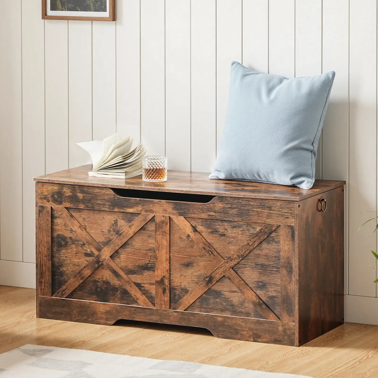 ·Stylish and Enduring: Made of premium particleboard, the blanket chest endures years of heavy use while holding up to 220 lb. Its wooden texture paired with framed style gives it a rustic charm that blends seamlessly with your home decor