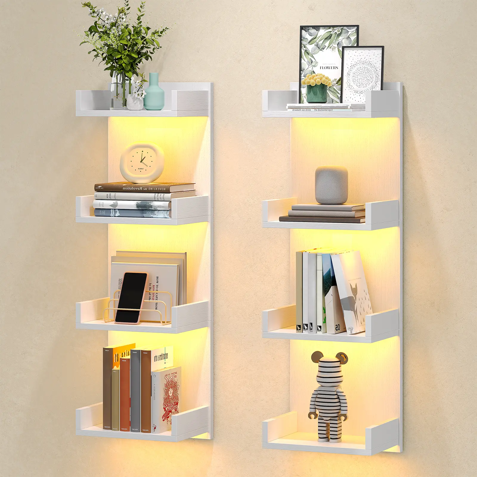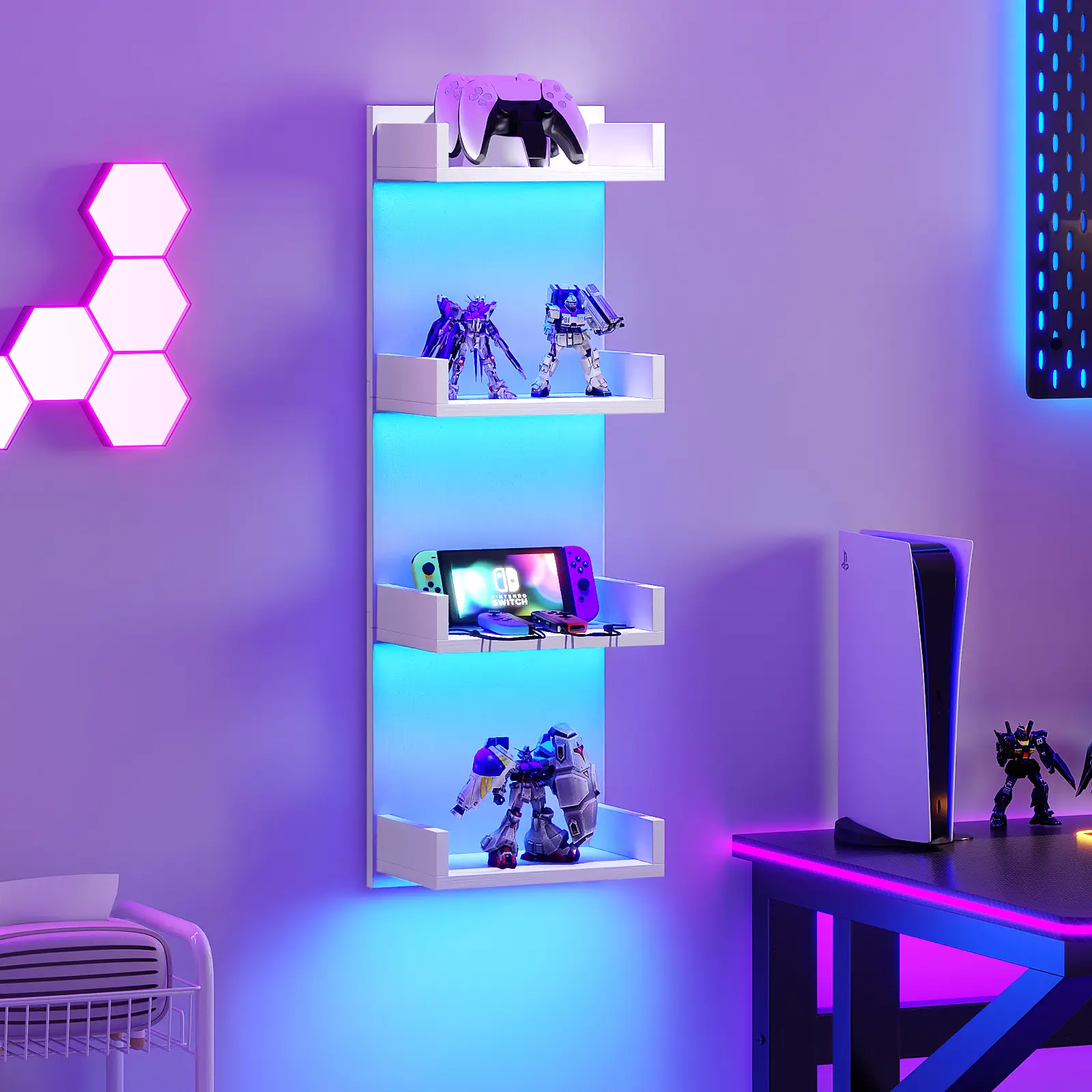 Each floating shelf has an LED strip underneath, supporting multiple colors, modes, and brightness levels.