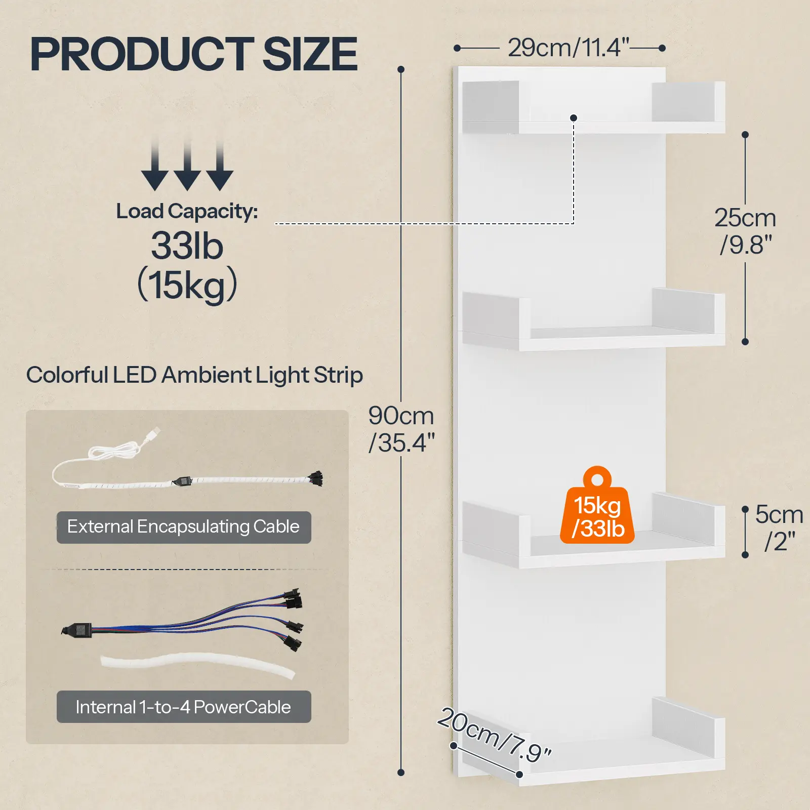 This 4-tier wall shelf with LED lights measures 11.4"L x 7.9"W x 35.4"H and features a modern minimalist design with a classic white finish.