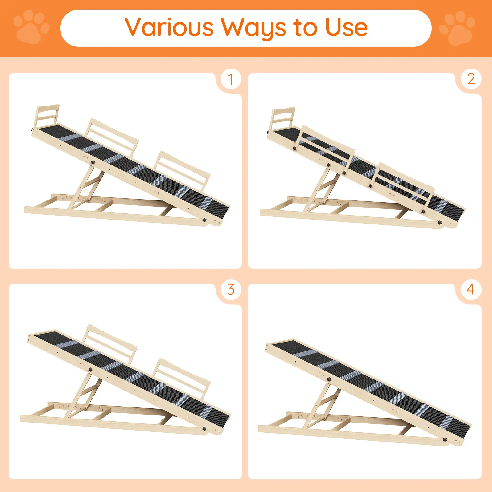 ·5-Level Height Adjustment for Custom Fit: This 63" long dog ramp features 5 adjustable height settings (18.1", 21", 24", 26.8", 29.5") to match your bed and sofa and delivers a stable incline for your pet's use in various home scenarios