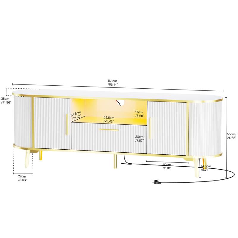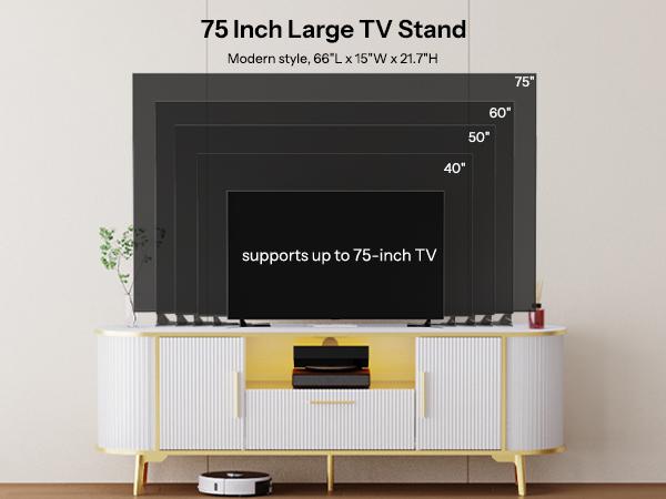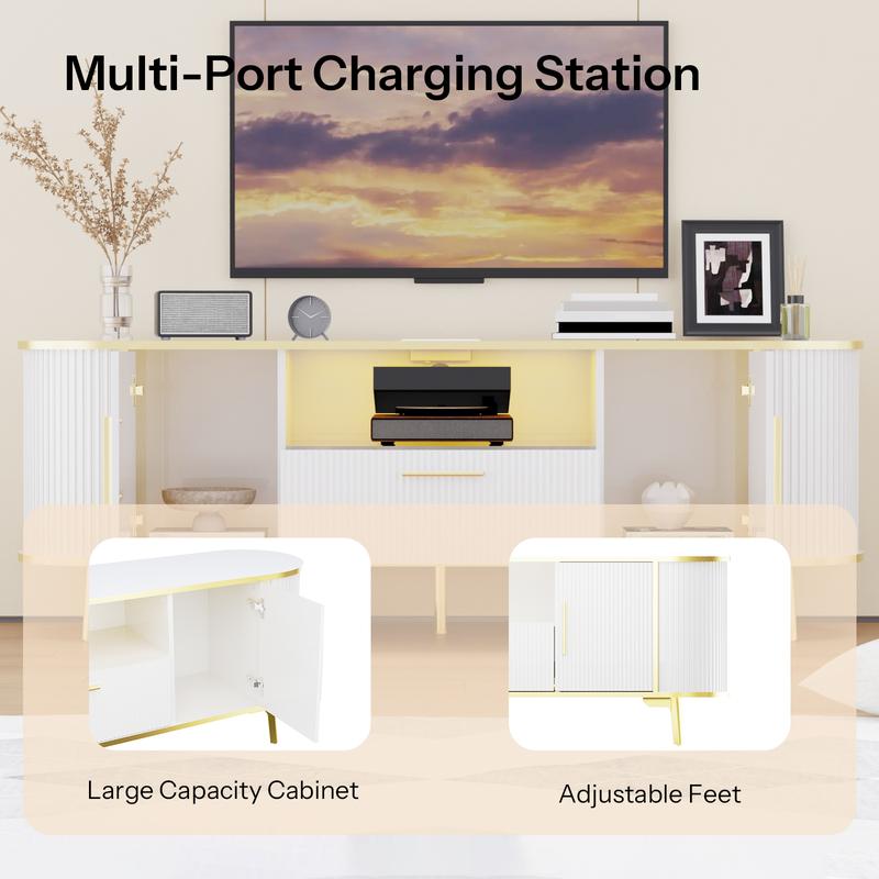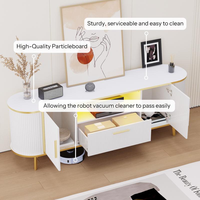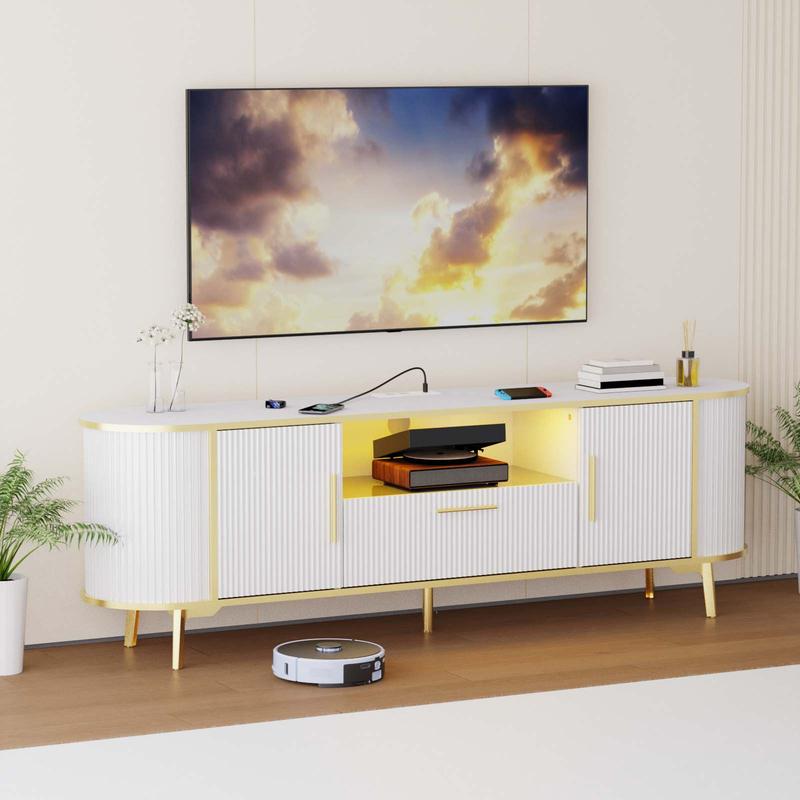 ·Robust Modern TV Stand: Engineered for longevity using premium materials and enduring wave-groove craftsmanship, this white and gold TV stand with a smooth surface is easy to clean. Angled legs with adjustable feet protect your valuable living room flooring
