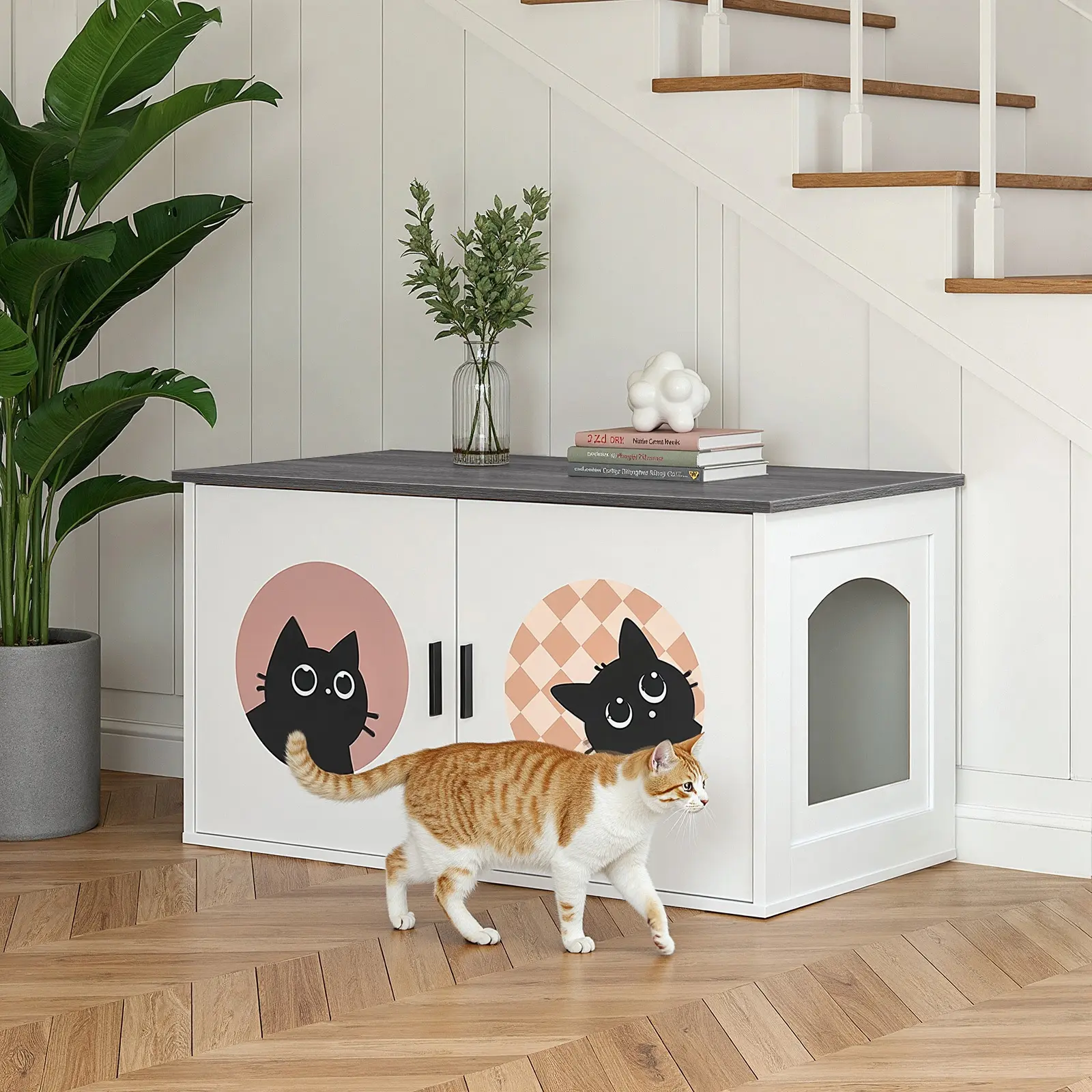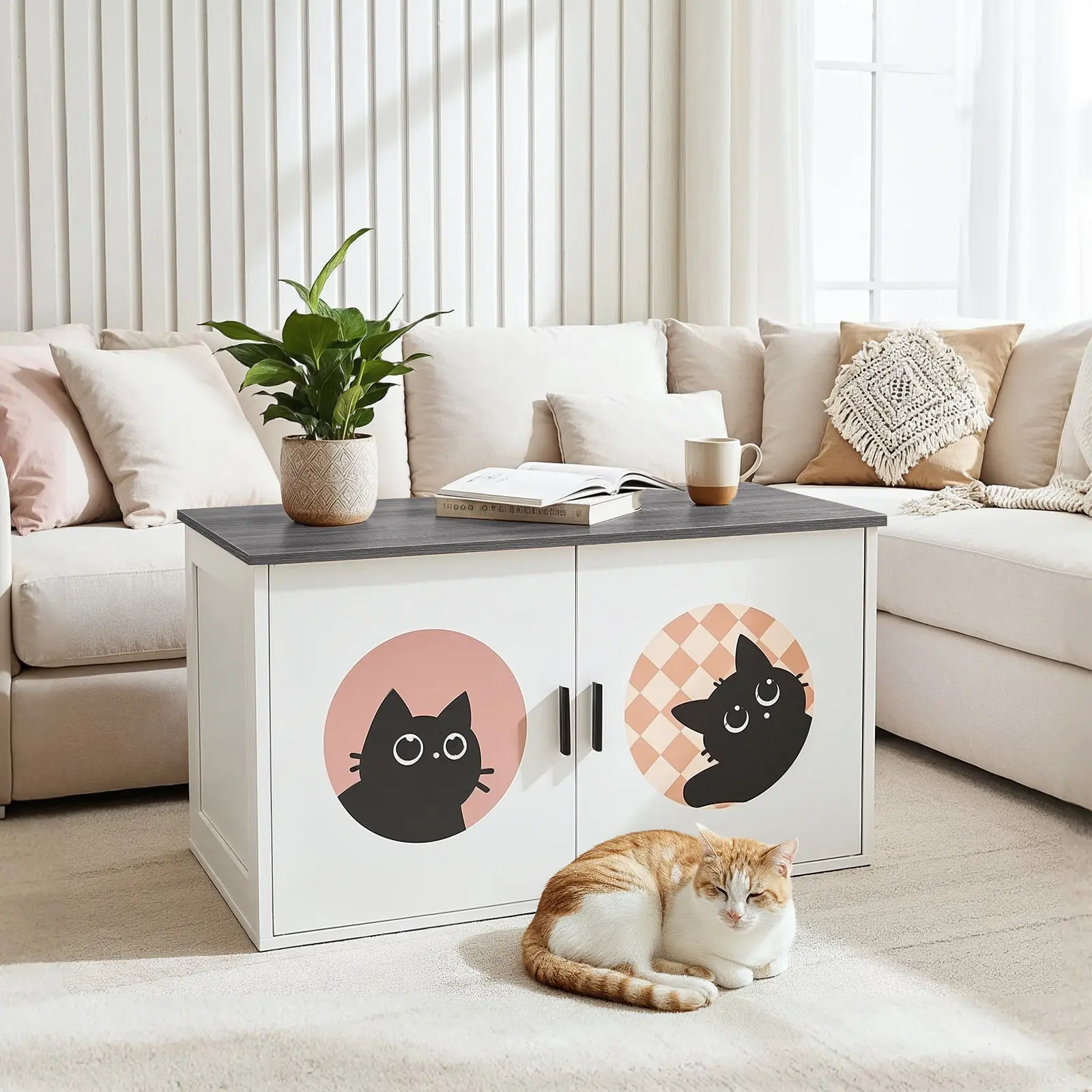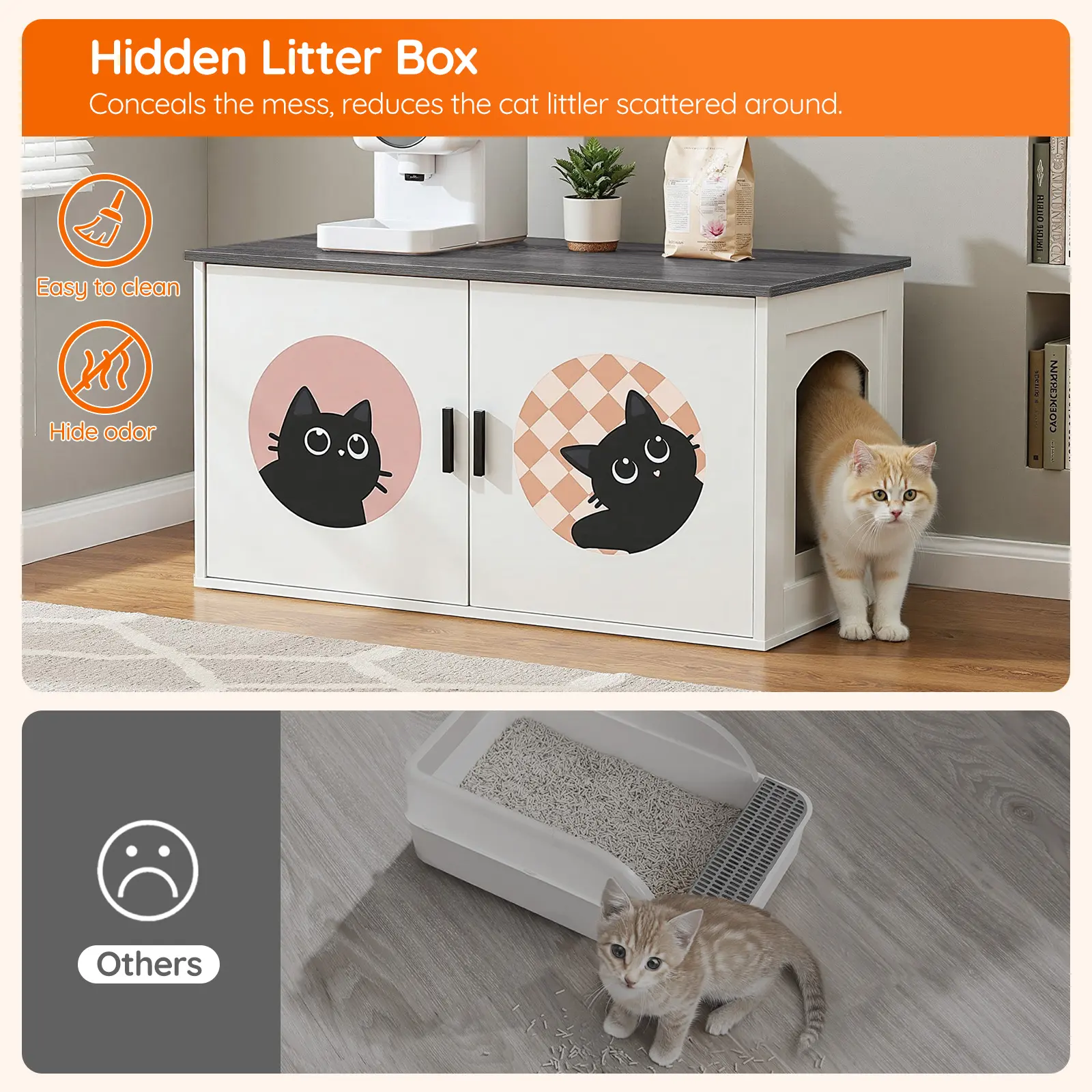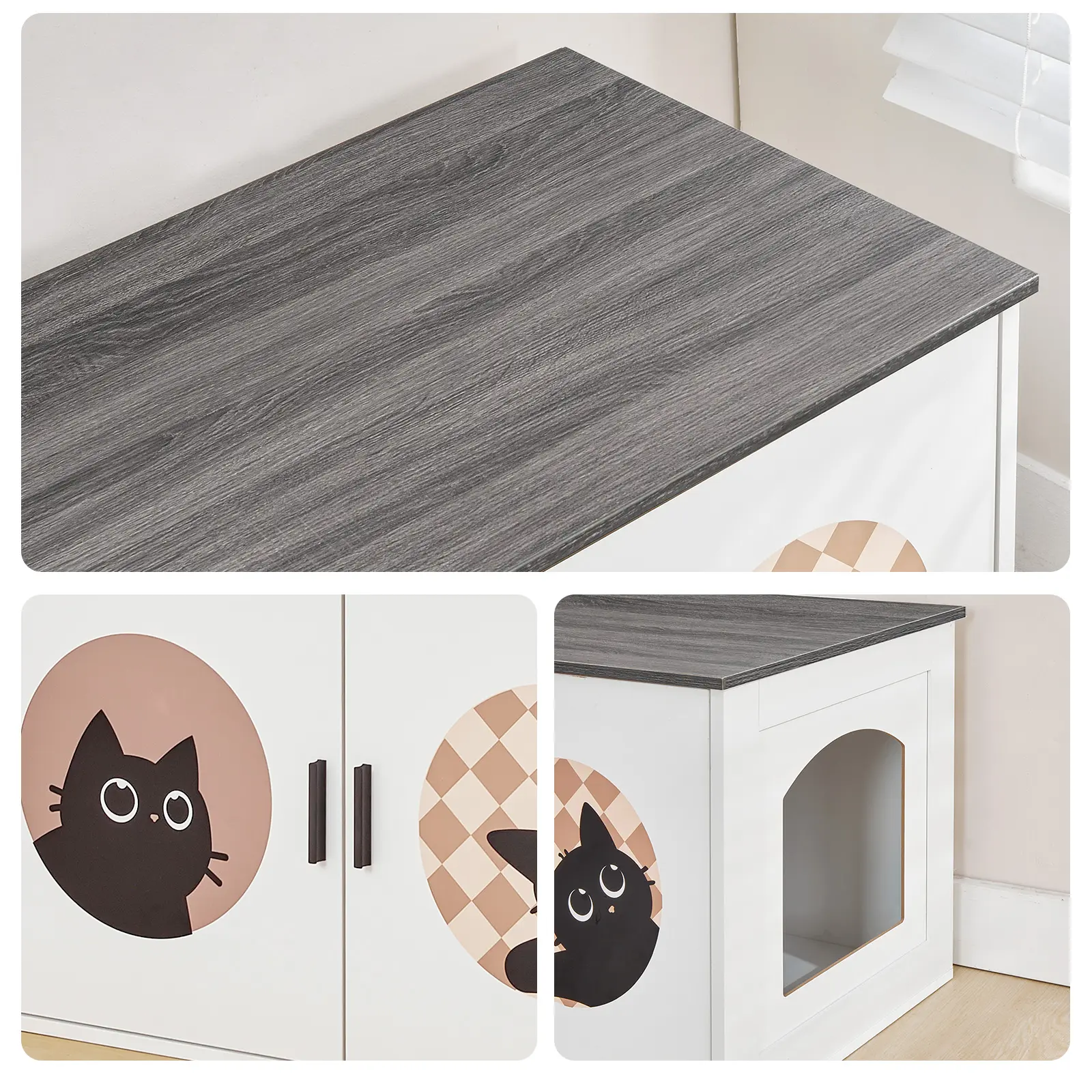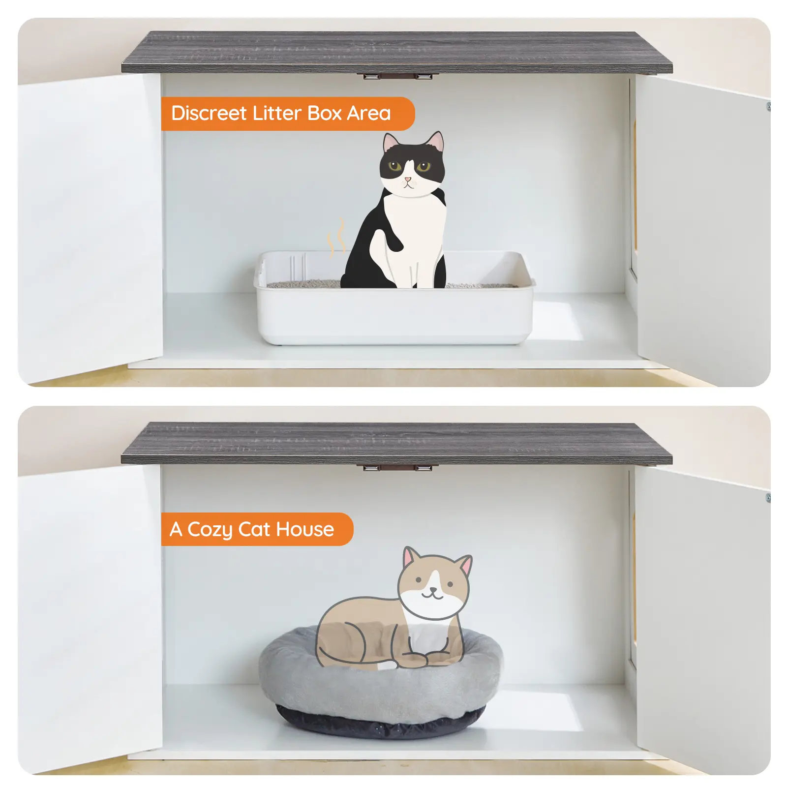 ·Versatile Design: Our cat litter box enclosure features a minimalist white finish combined with walnut accents, seamlessly integrating into various home styles, including living rooms, balconies, and bedroom corners