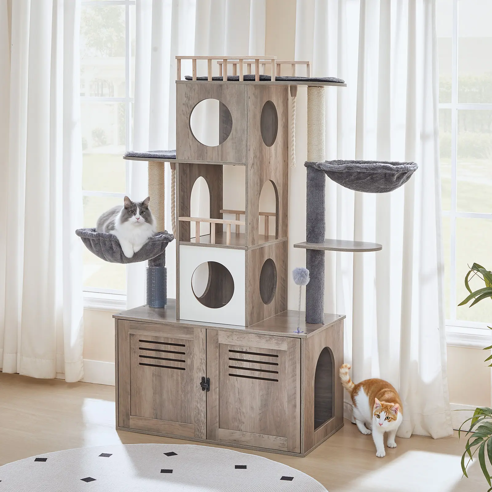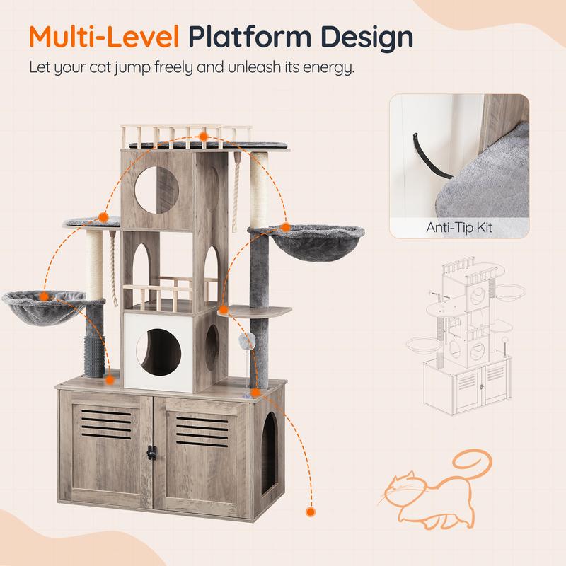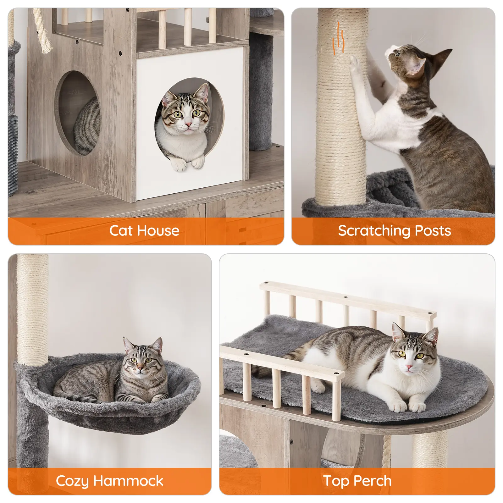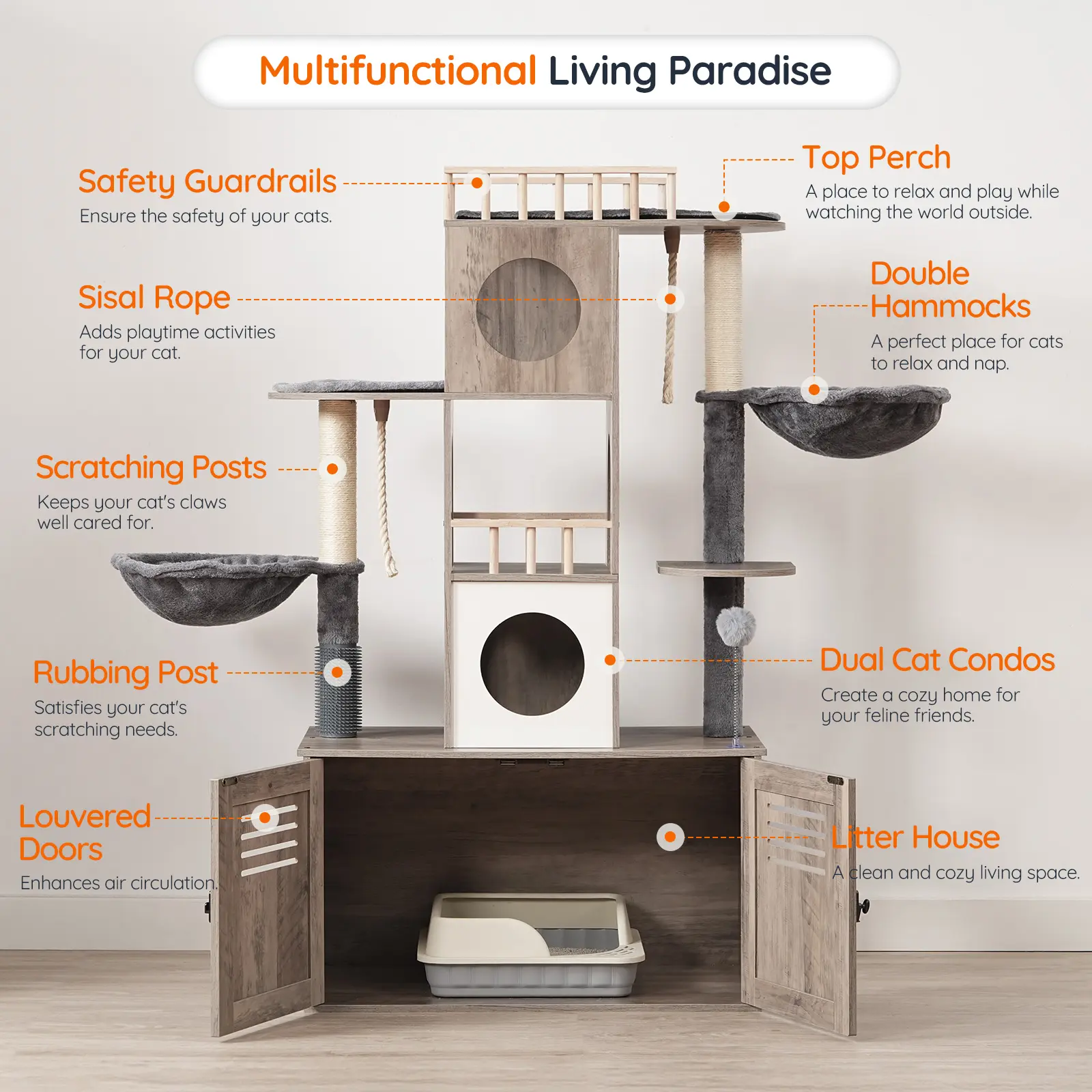 ·Multi-Functional Cat Tree: Our cat tower combines a litter box enclosure, cat condos, hammocks, a top platform, scratching posts, and a plush ball, providing a comprehensive solution for your cat's exploration, play, scratching, and resting needs