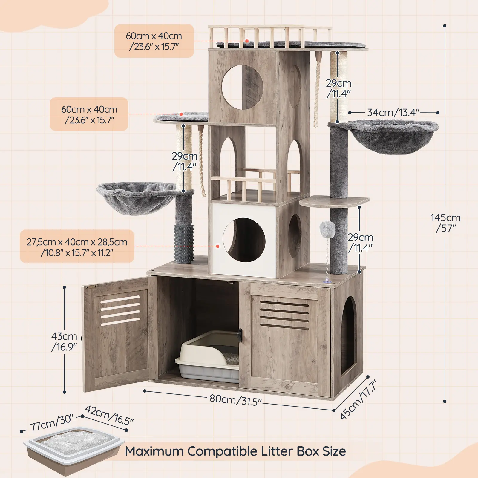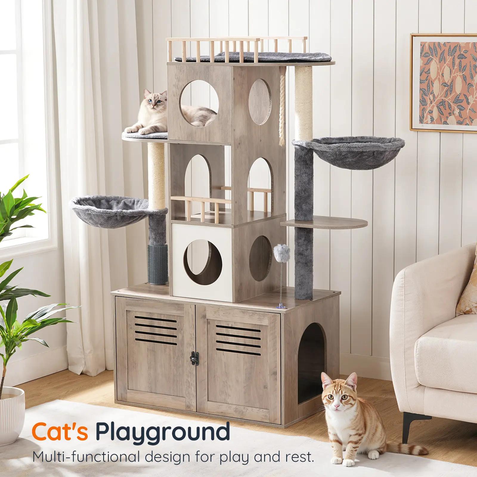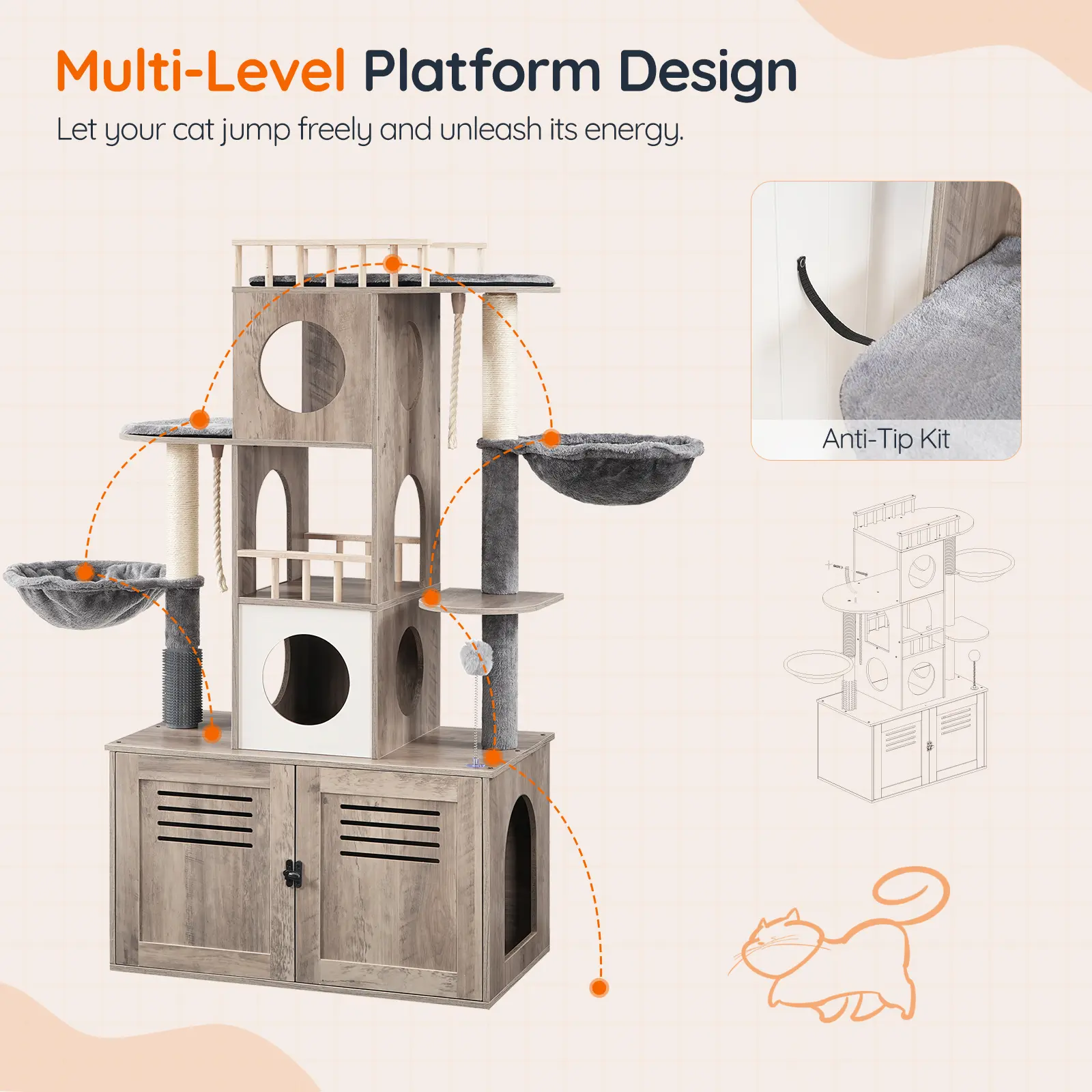 ·Multi-Functional Cat Tree: Our cat tower combines a litter box enclosure, cat condos, hammocks, a top platform, scratching posts, and a plush ball, providing a comprehensive solution for your cat's exploration, play, scratching, and resting needs
