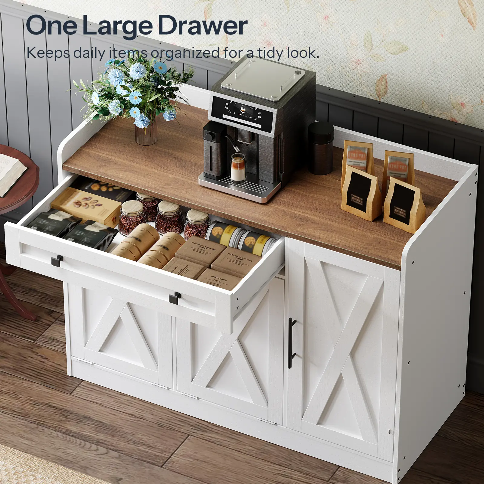 ·Versatile Design: Ideal for storing clothes and supplies in the laundry room, this cabinet also functions as a display unit in your hallway or living room. Its top panel holds potted plants and decorations, while the drawer and cabinet store books, tissues, and daily essentials
