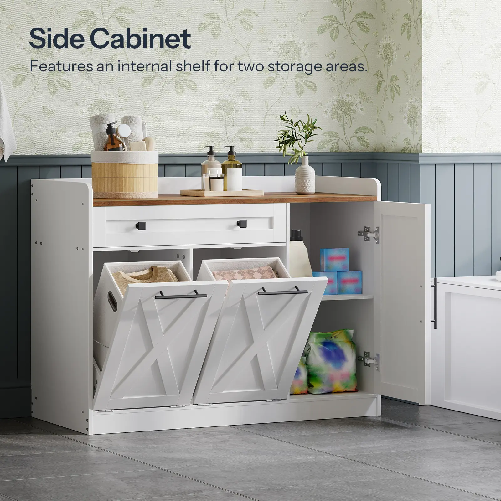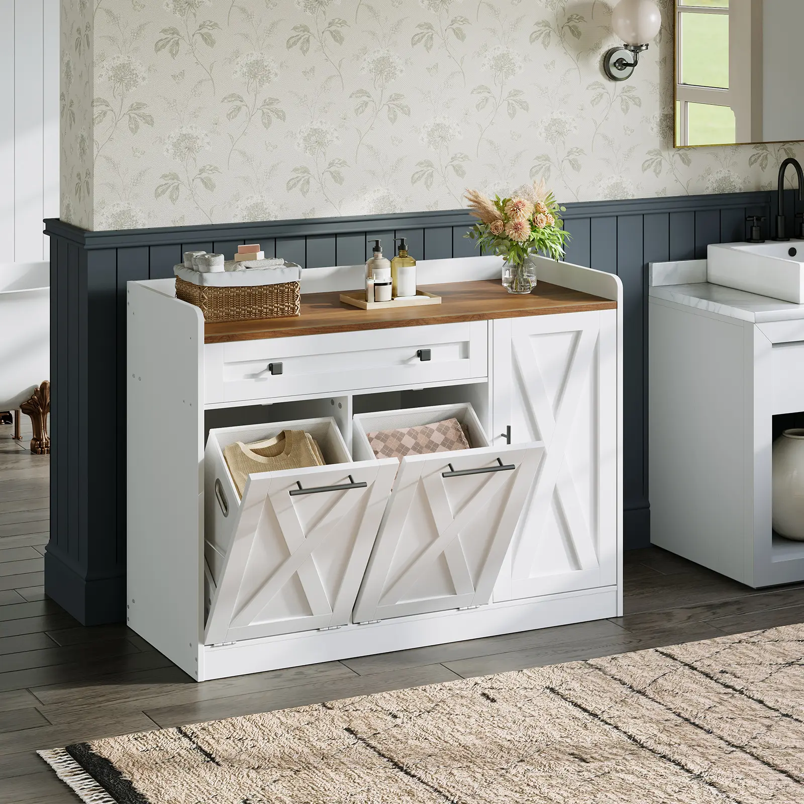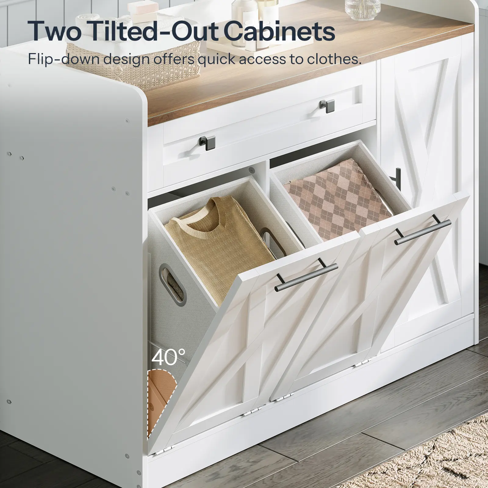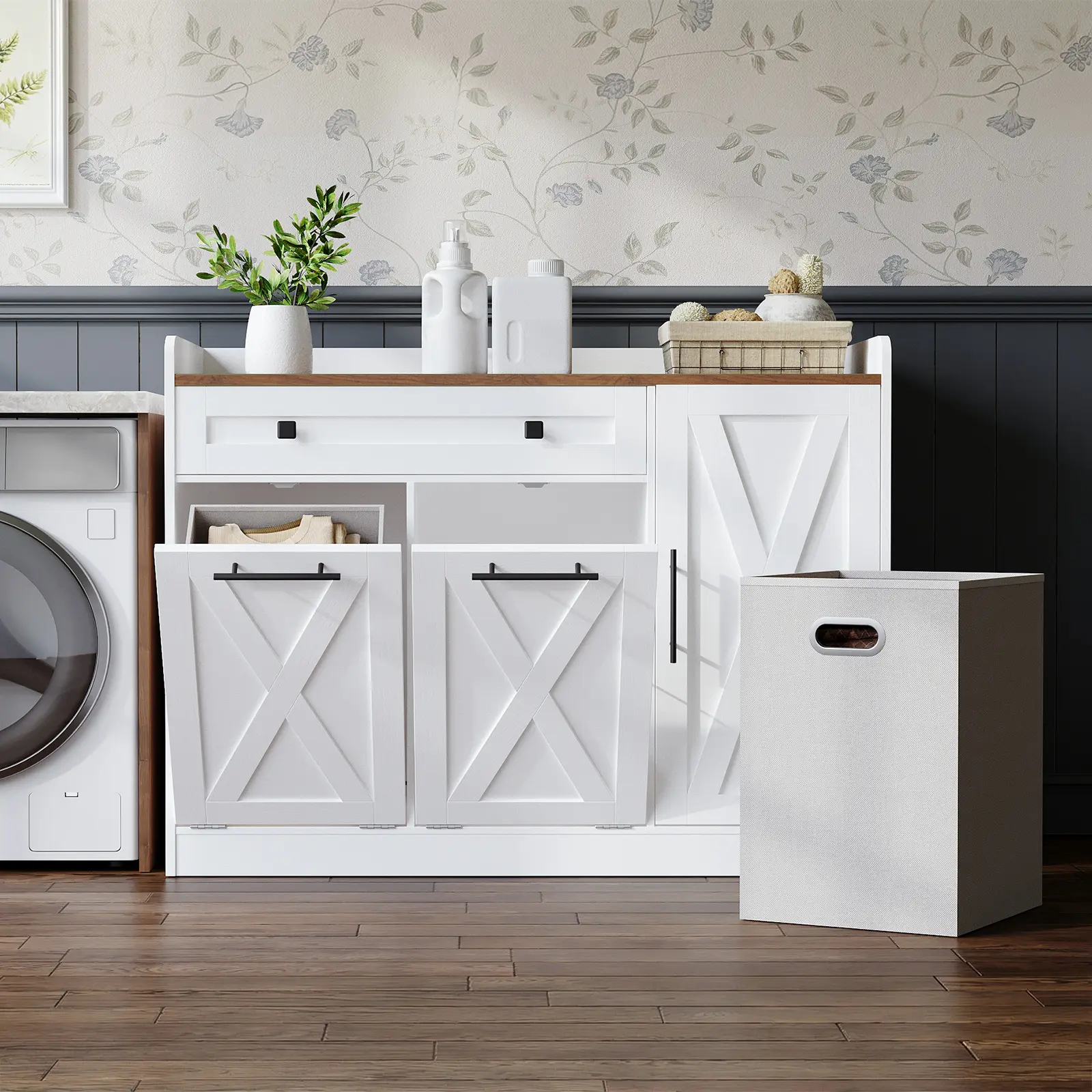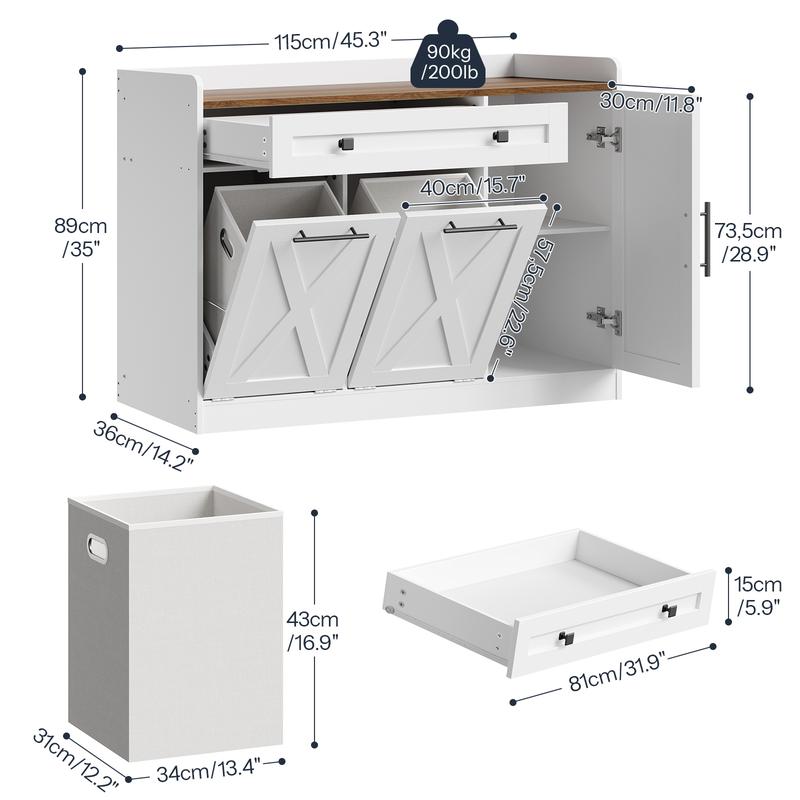 ·Two Removable Baskets: Equipped with two 12-gallon non-woven fabric laundry baskets, the laundry cabinet supports organized storage. The removable baskets can be easily lifted and transported to the laundry room, significantly enhancing your laundry efficiency