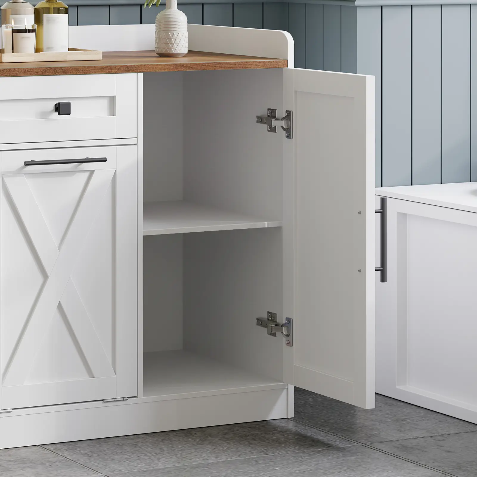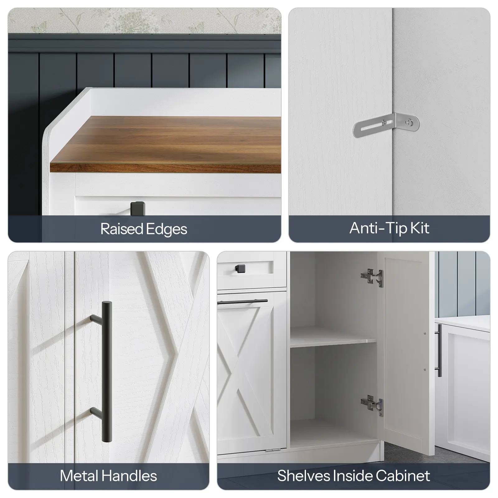 ·Minimalist & Stylish Look: With a combination of white and walnut colors, the trash can cabinet (trash can not included) boasts a farmhouse charm to seamlessly integrate into various home settings, including kitchens, living rooms, and bathrooms, elevating the aesthetic appeal