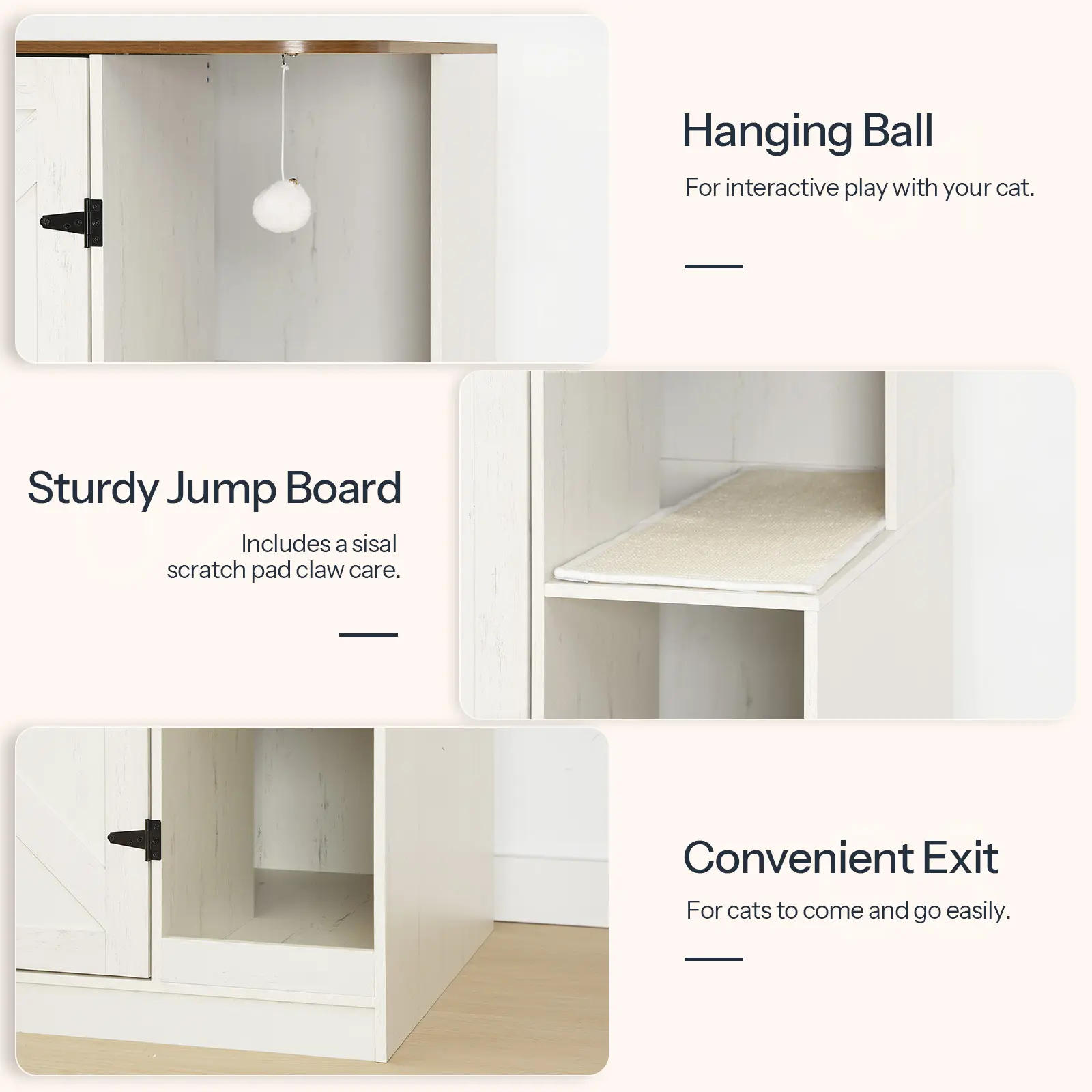 ·Multi-Functional Design: This hidden litter box furniture provides hidden space for litter and rest. It includes a sisal scratch pad and a hanging toy ball for clawing and play. It also works as a side table to store pet supplies, keeping your living area neat