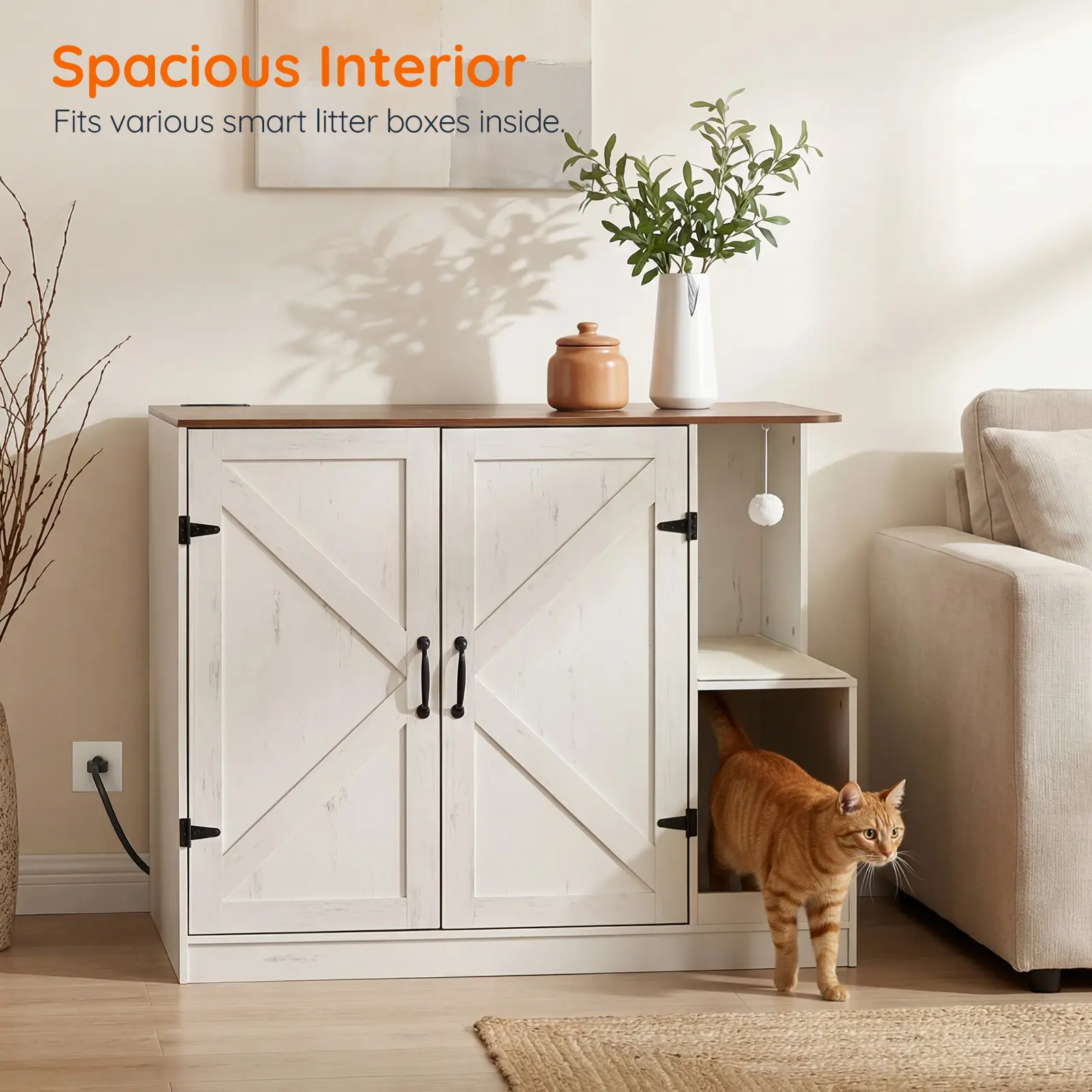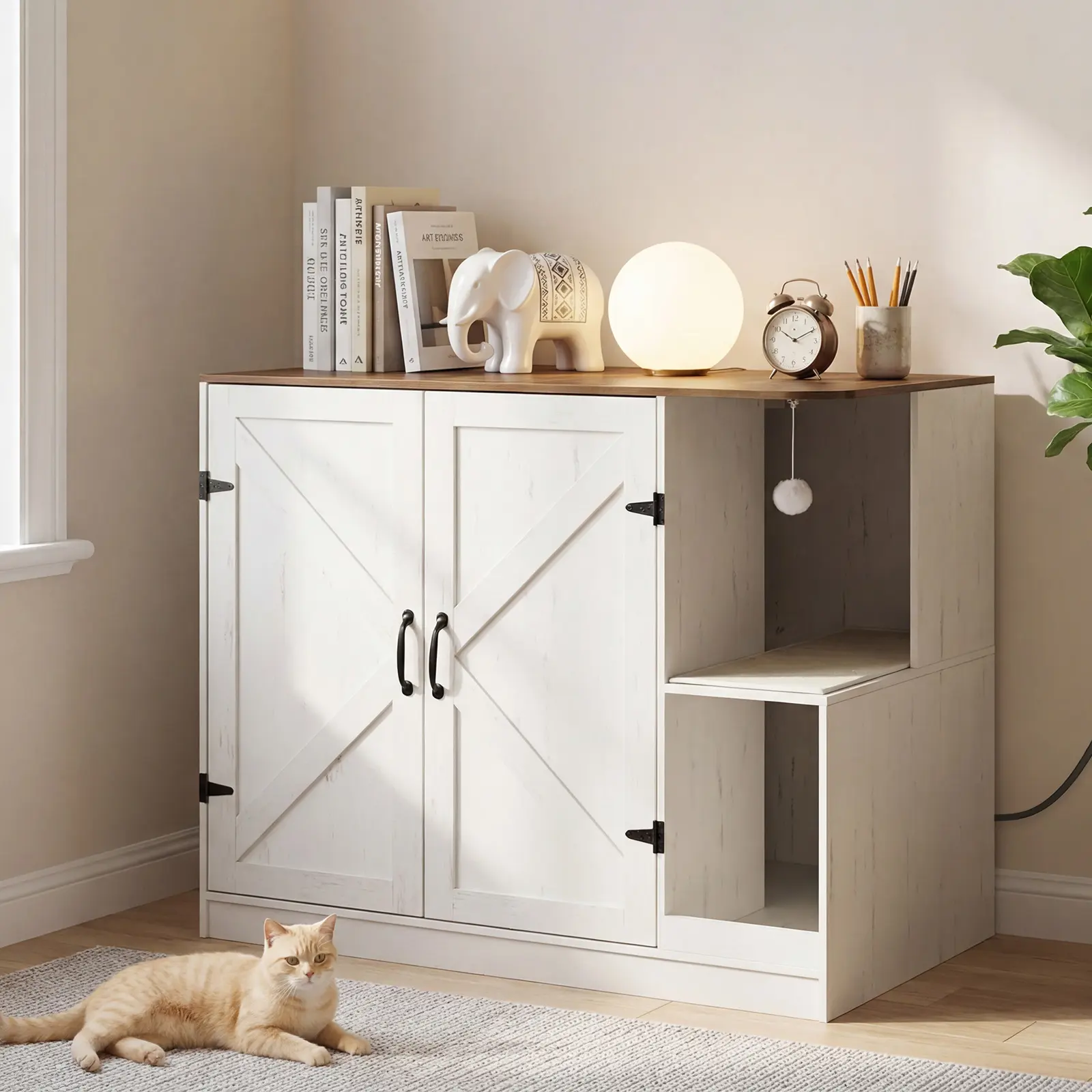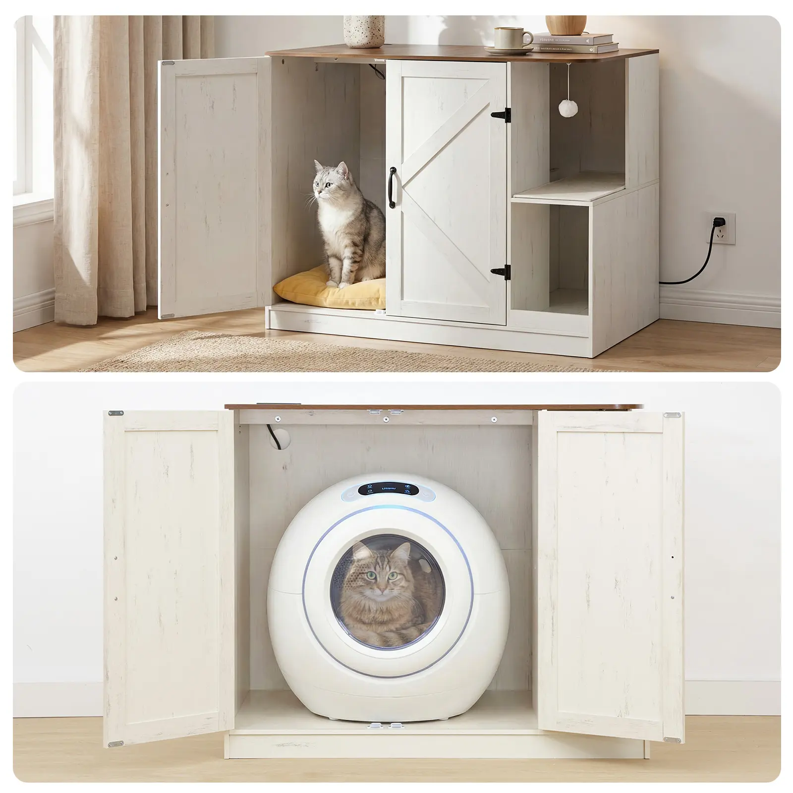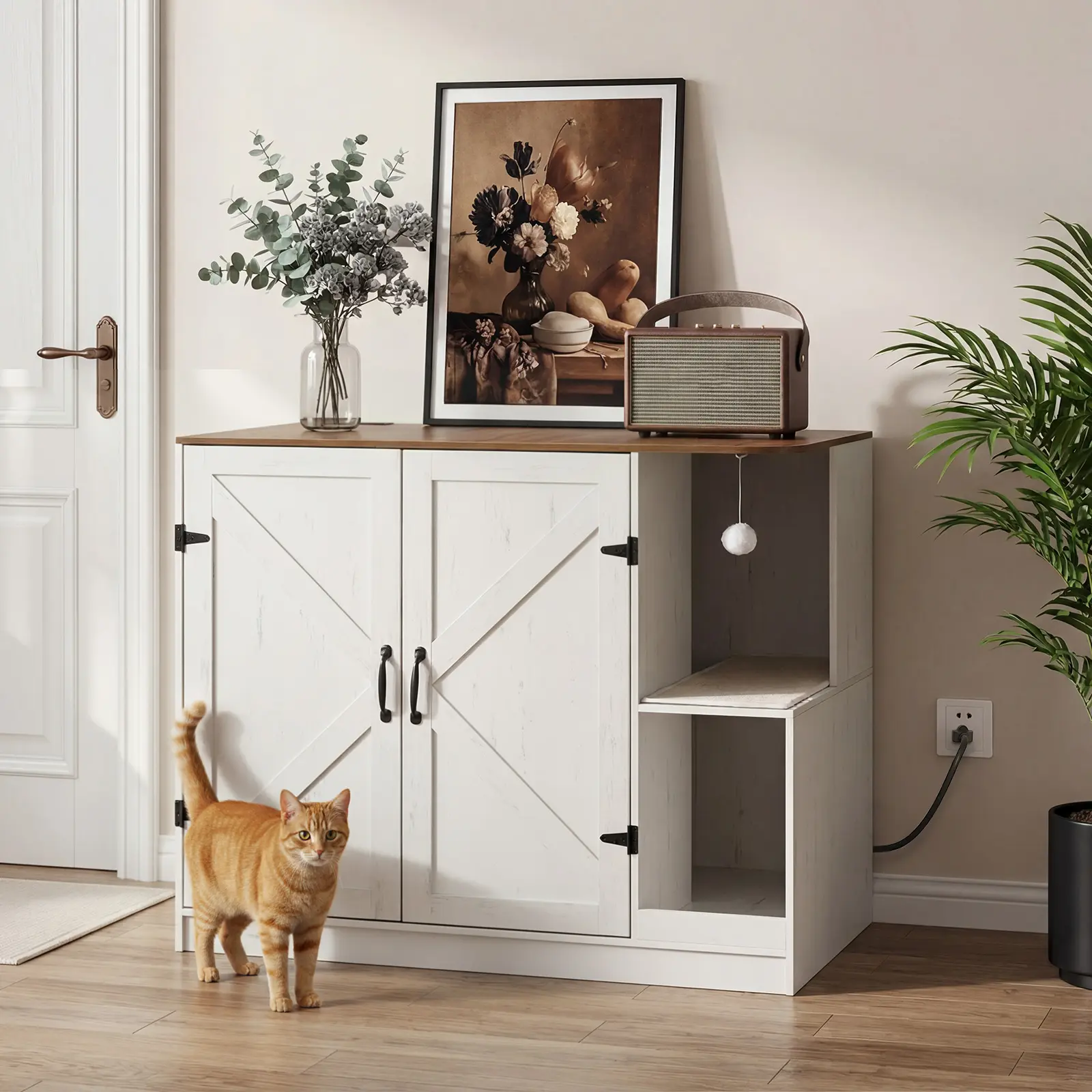 ·Stylish Litter Box Enclosure: This cat furniture features white framed doors and walnut-style surface with black metal accents for a warm farmhouse look. It blends into various rooms like living areas, adding a cozy touch to your home decor