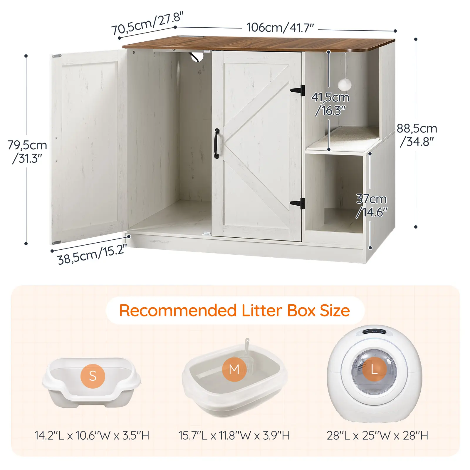 ·Ample Storage Space: With dimensions of 31.5"L x 27.8"W x 35.4"H, the interior of this litter box furniture is roomy enough for two litter boxes or beds, helping multi-cat homes stay tidy. The wide surface can hold pet treats, books, or plants for both storage and decoration