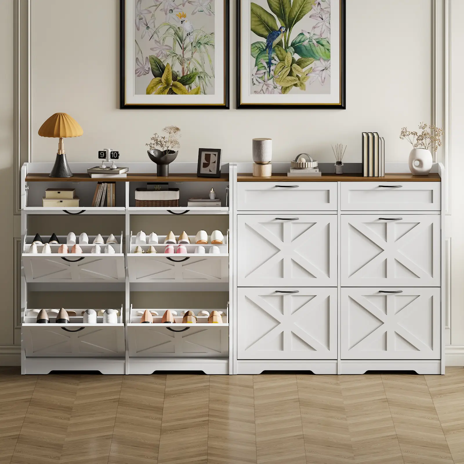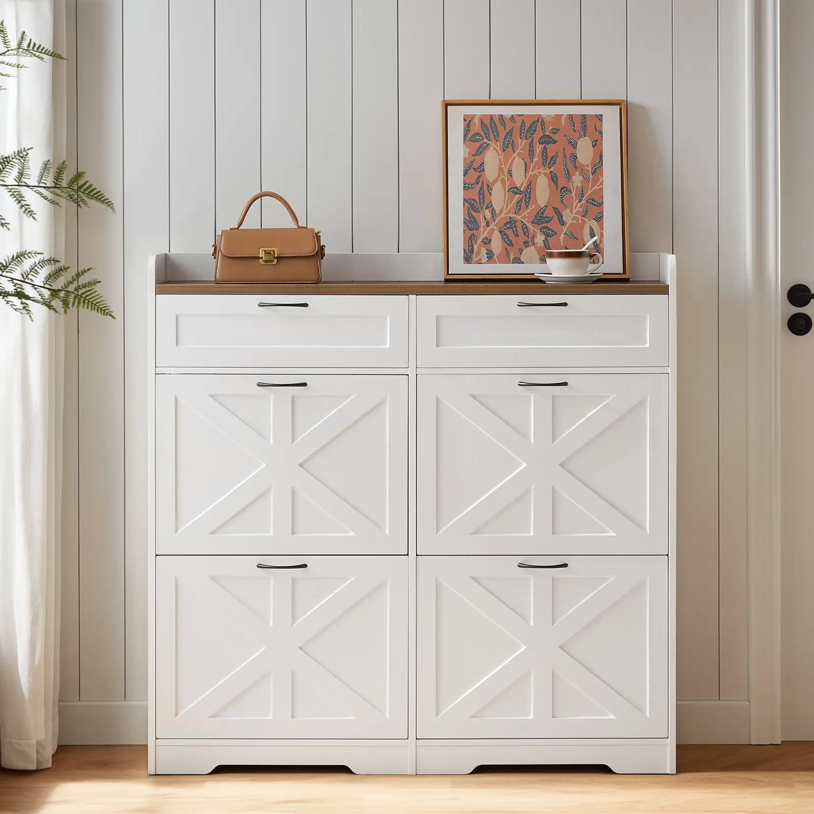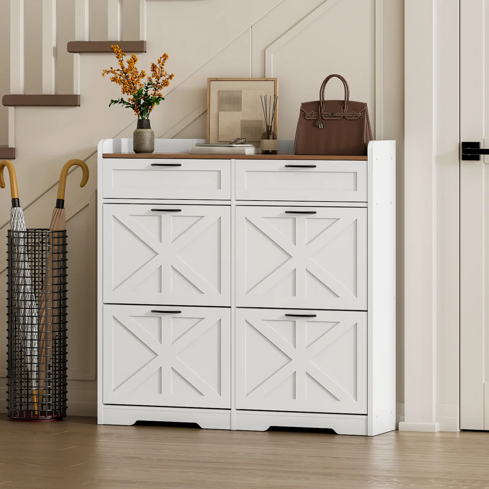 ·Timeless Design for Every Room: Whether placed in a foyer, hallway, living room, or porch, this farmhouse flip shoe cabinet blends in effortlessly. It's practical to simplify shoe management while adding a clean, stylish look to your decor