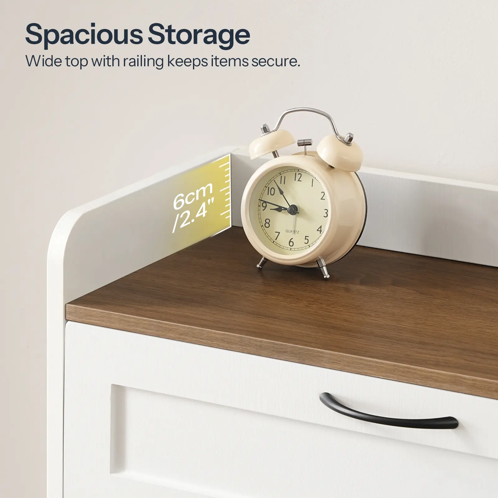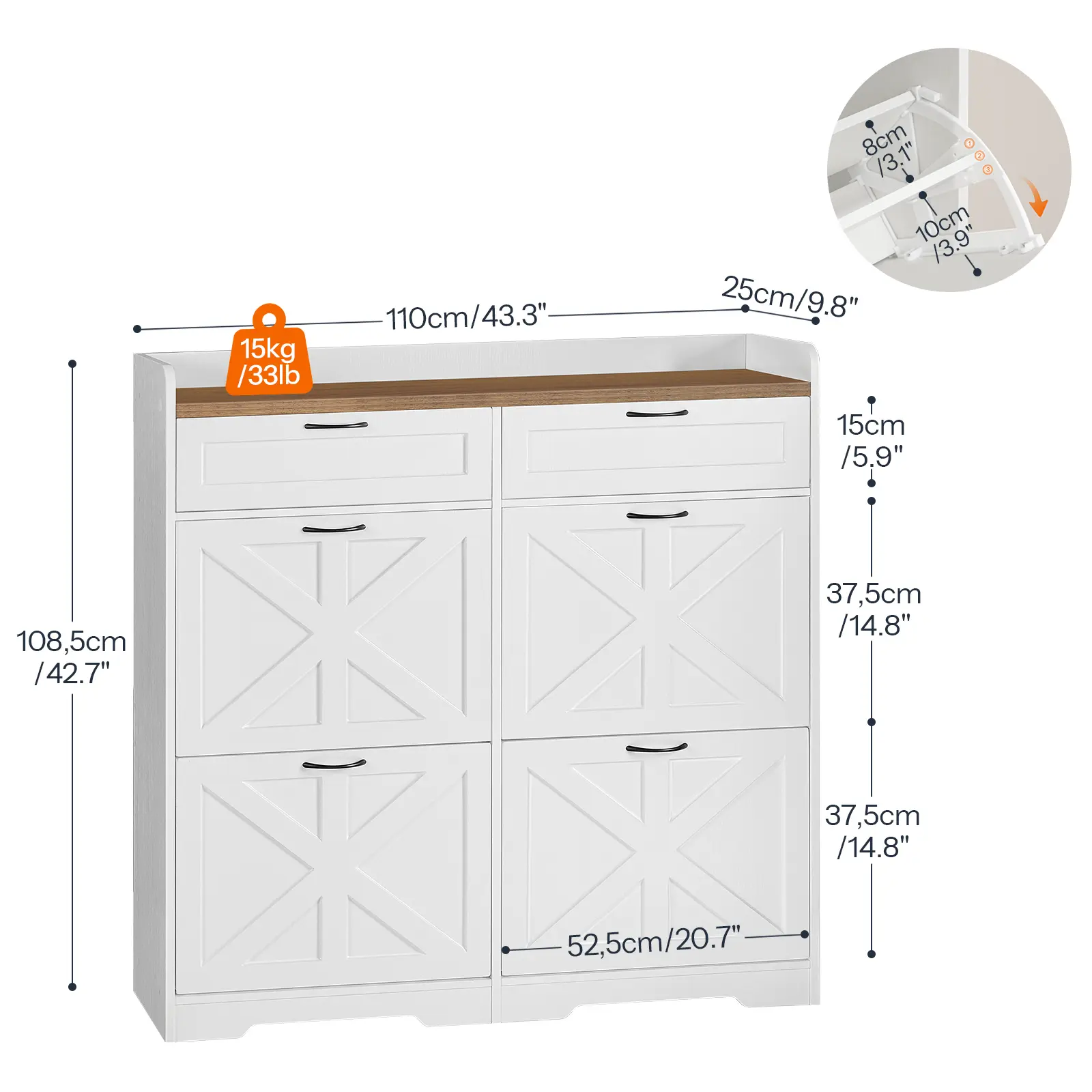 ·Space-Saving and Stylish: This slim shoe cabinet protects shoes from dust and pets, fitting snugly in small entryways. The white-and-walnut color scheme, plus a top railing for keys and other essentials, enhances tidiness in any interior style