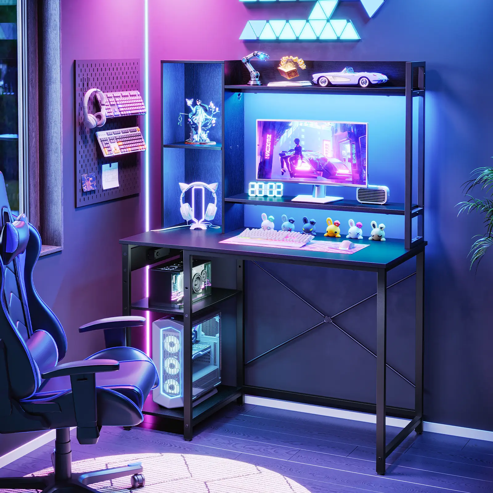·Generous Storage Space: Designed with 2 spacious compartments for showcasing your ornaments, along with open horizontal shelves and a lower adjustable shelf, this gaming desk provides ample and organized storage for books, collectibles, and your computer equipment