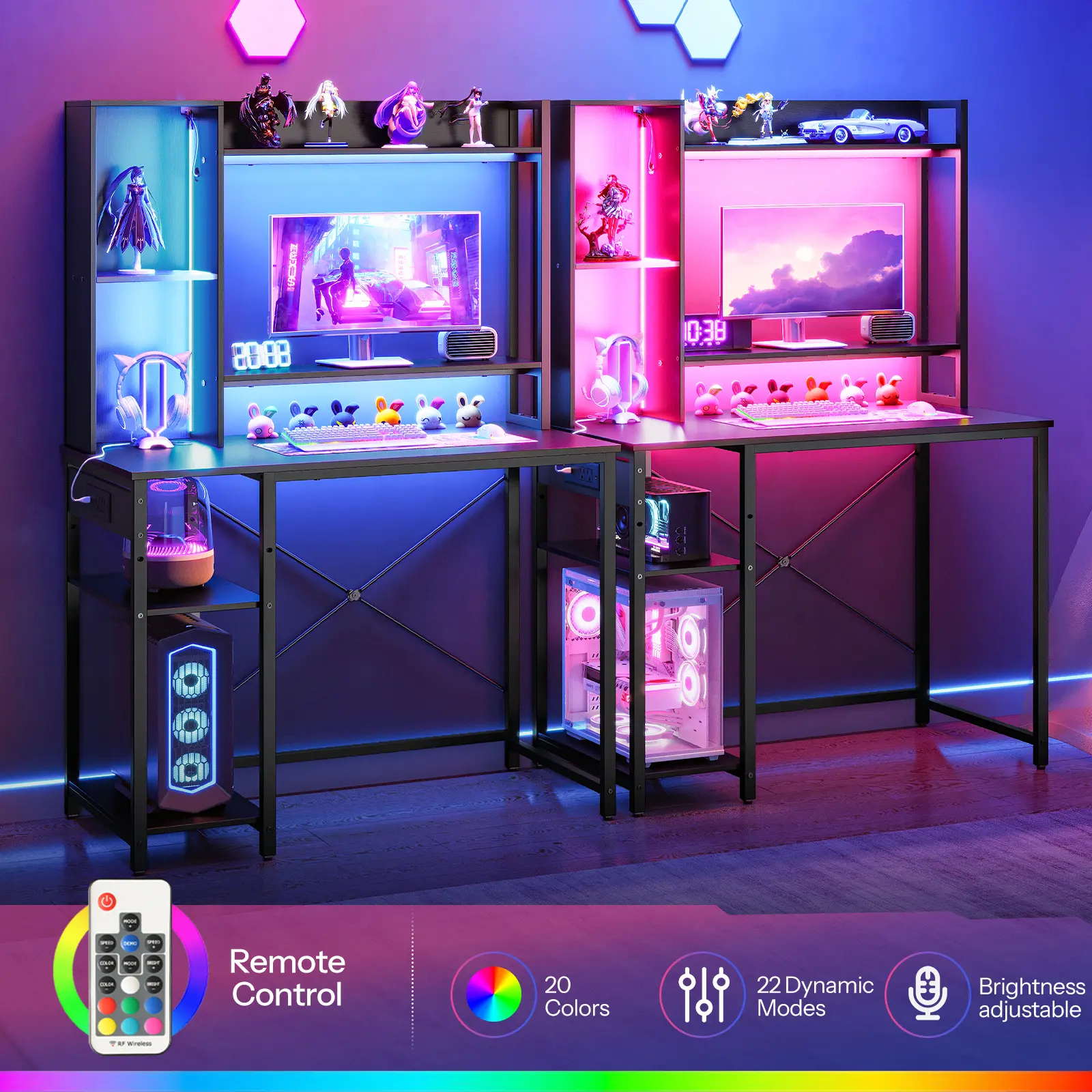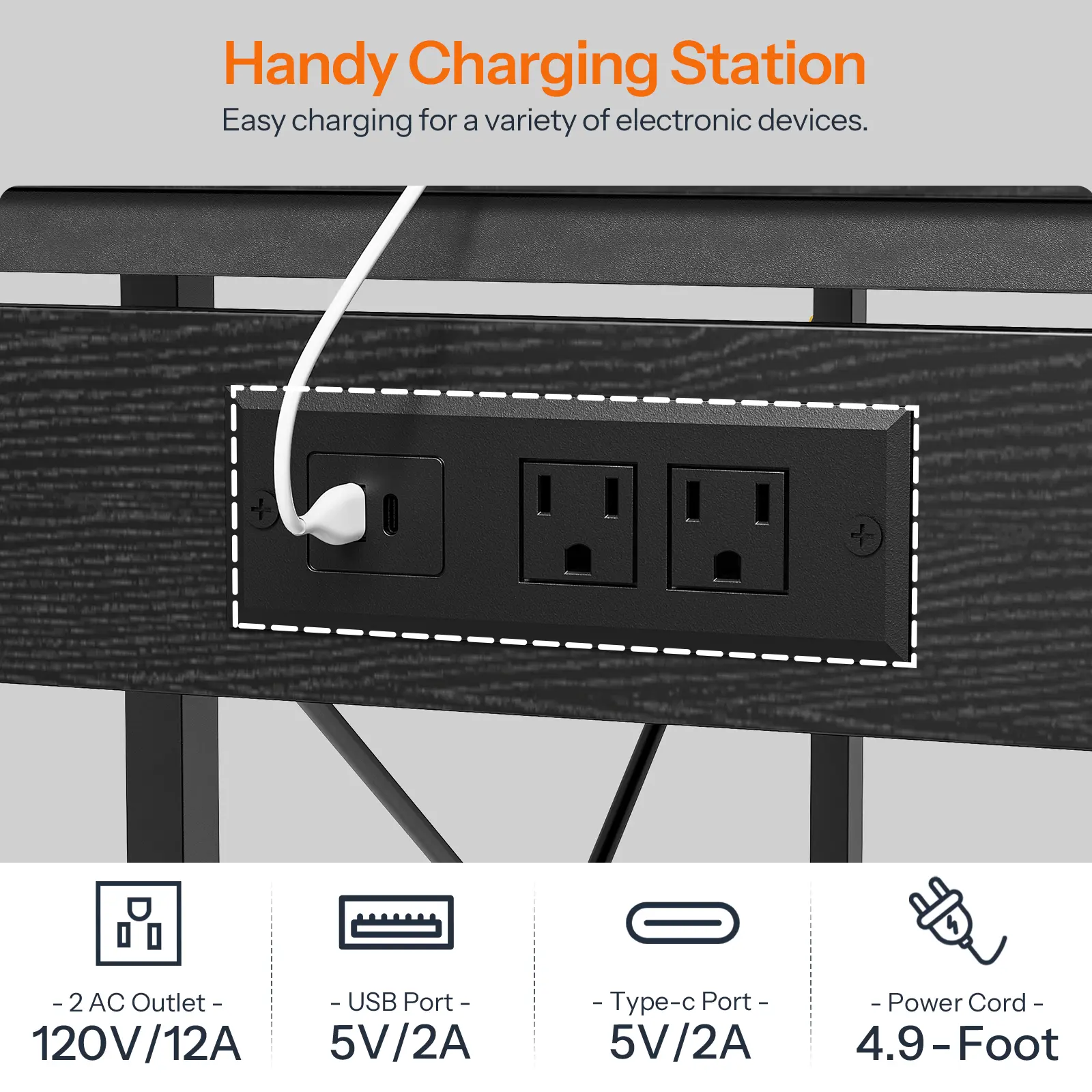 ·Modern Gaming Style: The computer desk features a power strip with 2 AC outlets, 1 USB-A, and 1 Type-C port for convenient device charging. The adjustable LED light strip offers multiple colors and dynamic modes to enhance your workspace ambiance
