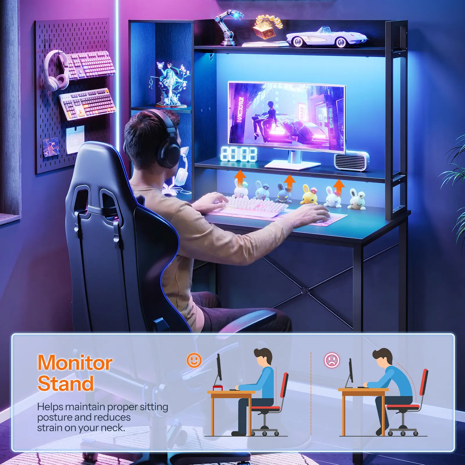 ·Ergonomic Design for Comfort: With a monitor stand, the home office desk elevates your screen to eye level, promoting good posture and reducing strain on your neck and back. Experience elevated comfort and productivity as you work or game for hours