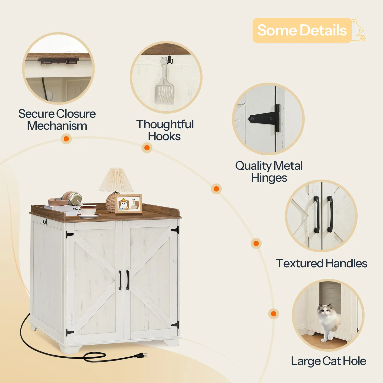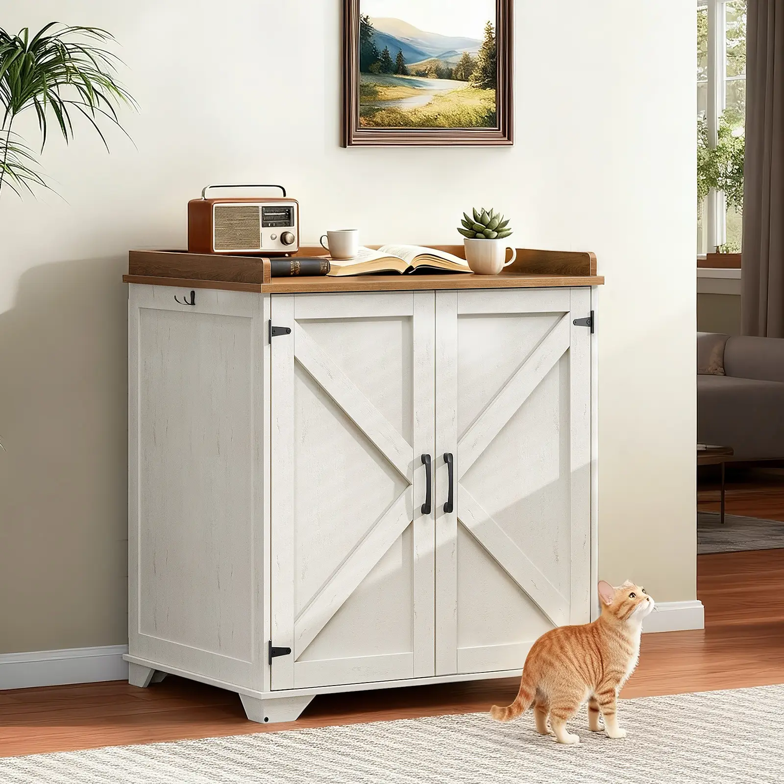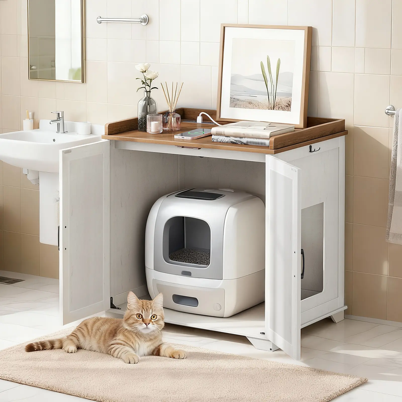 ·Versatile Platform: A platform with raised edges is equipped with this cat litter box enclosure for storing items, such as cat food or photo frames. Two hooks on each side also help organize leashes and keys, keeping pet supplies tidy and enhancing space efficiency
