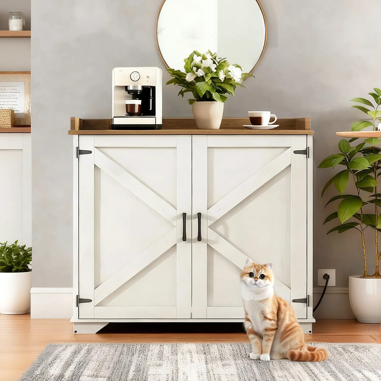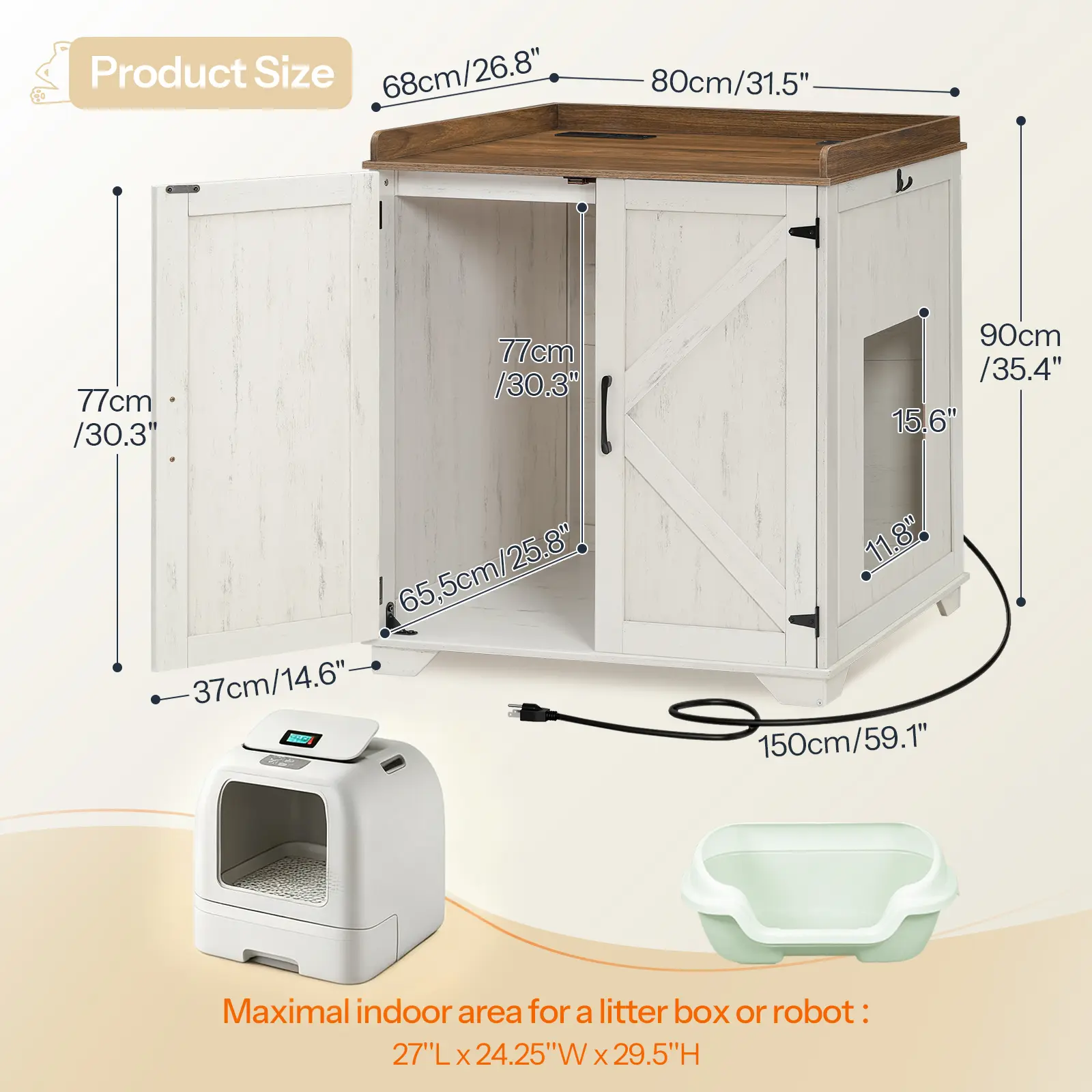 ·Convenient Charging Station: This hidden litter box furniture features a charging station with 2 AC outlets, 1 USB port, 1 Type-C port, and a 59.1-foot power cord, conveniently powering automatic litter boxes or charging other devices