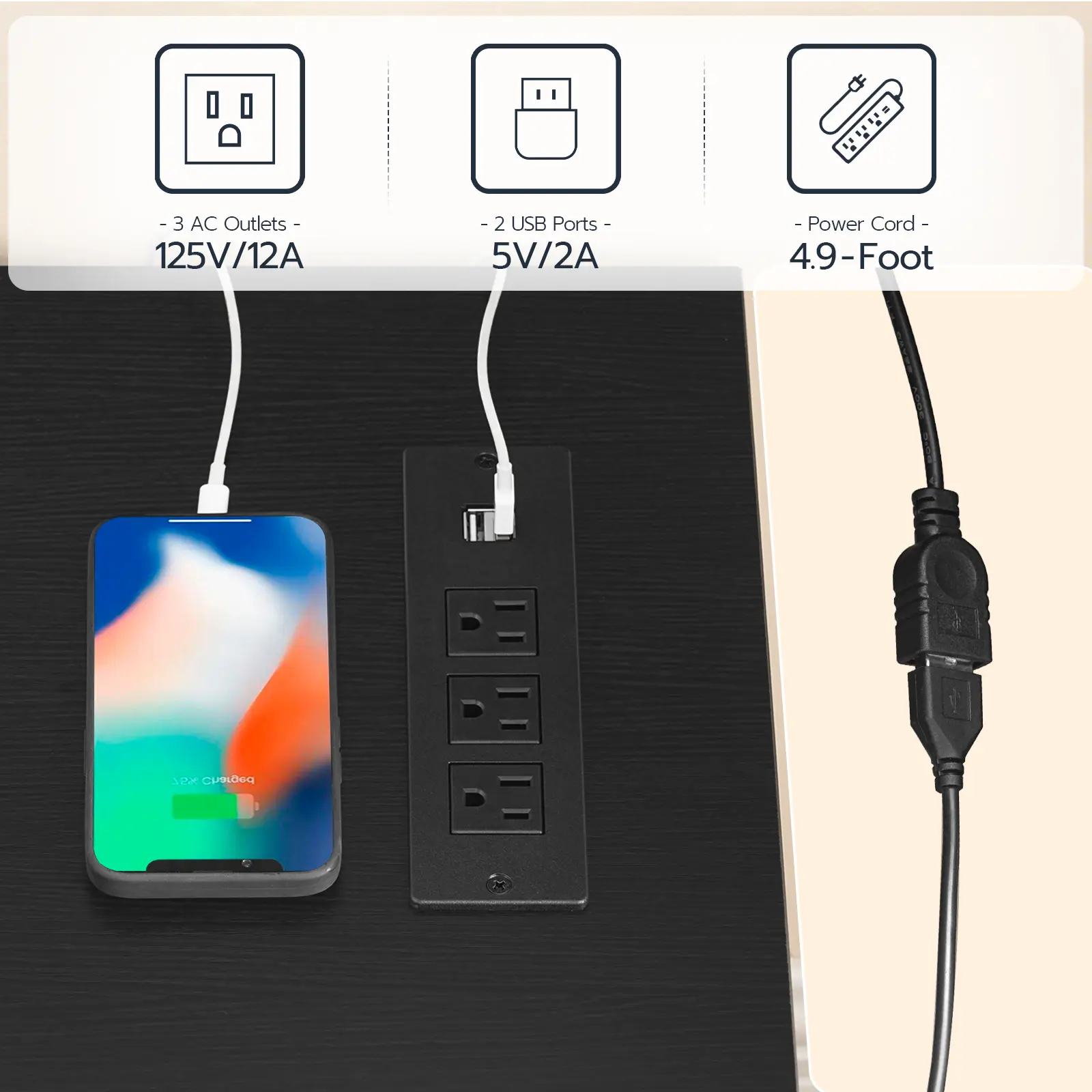 The bottom USB port offers easy connection to light strip for tidy cable management.