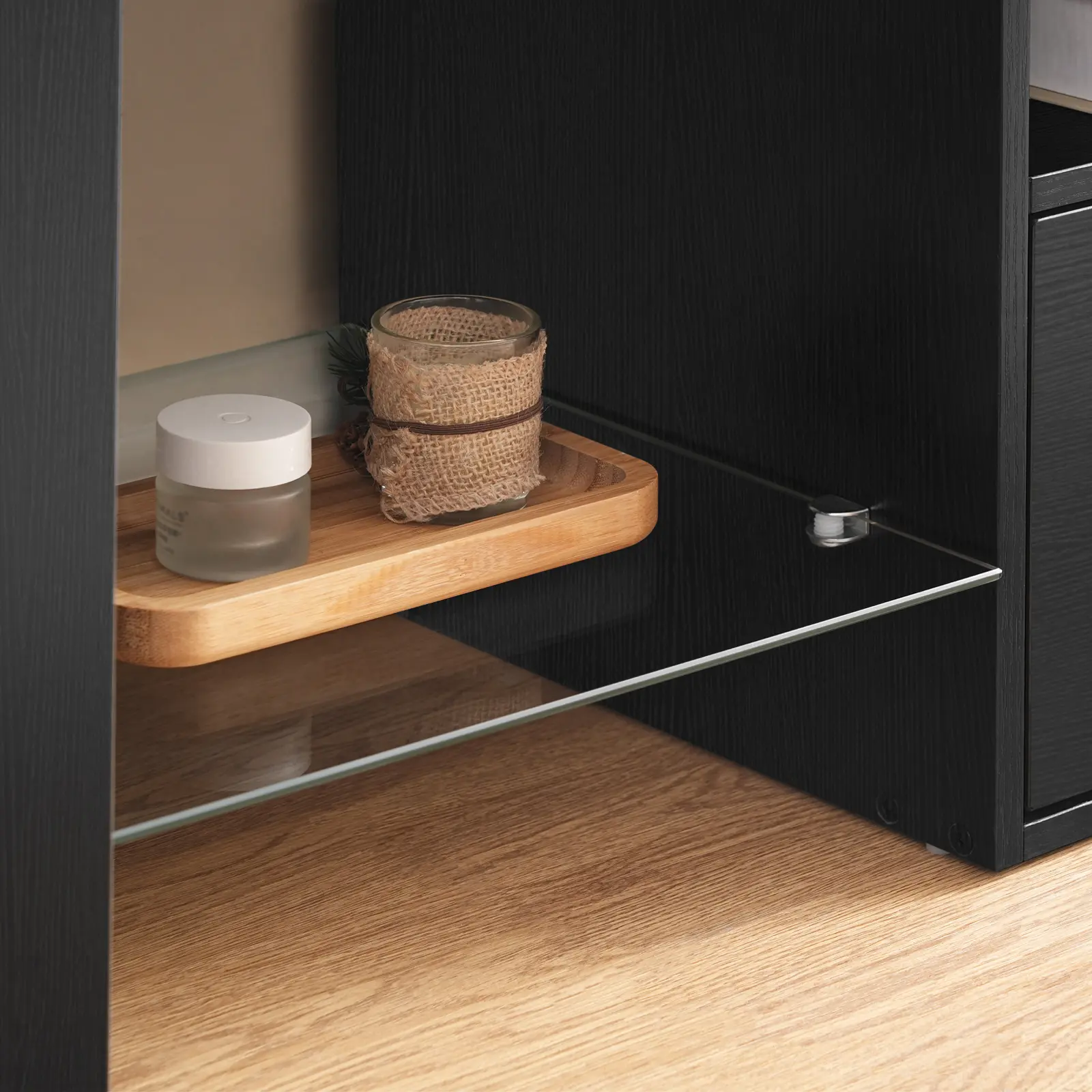 It consists of 3 open compartments, 1 roomy drawer, and 1 wide top with ample space for both open and hidden storage, ensuring a clean and tidy viewing experience.