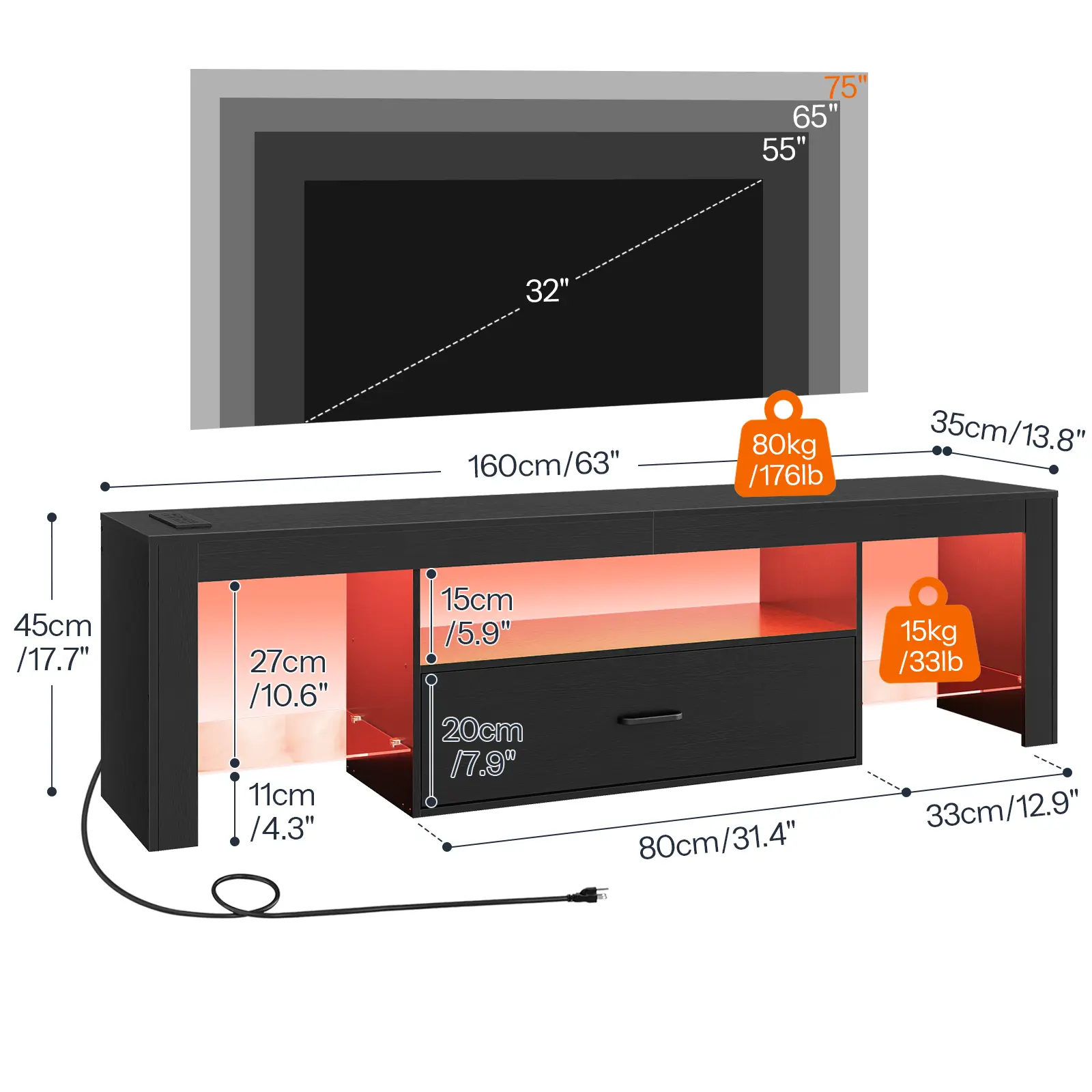 Sized 63âL x 13.8âW x 17.7âH, the entertainment center fits TVs up to 65â.