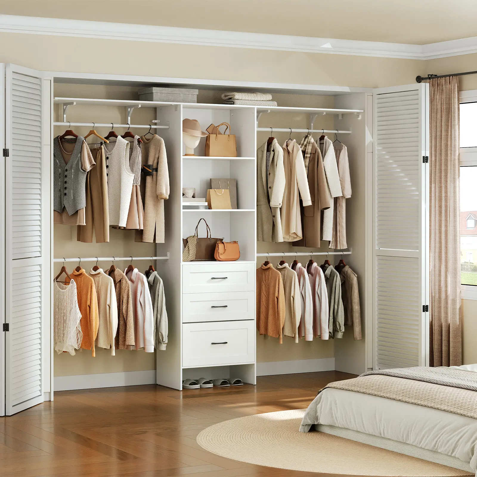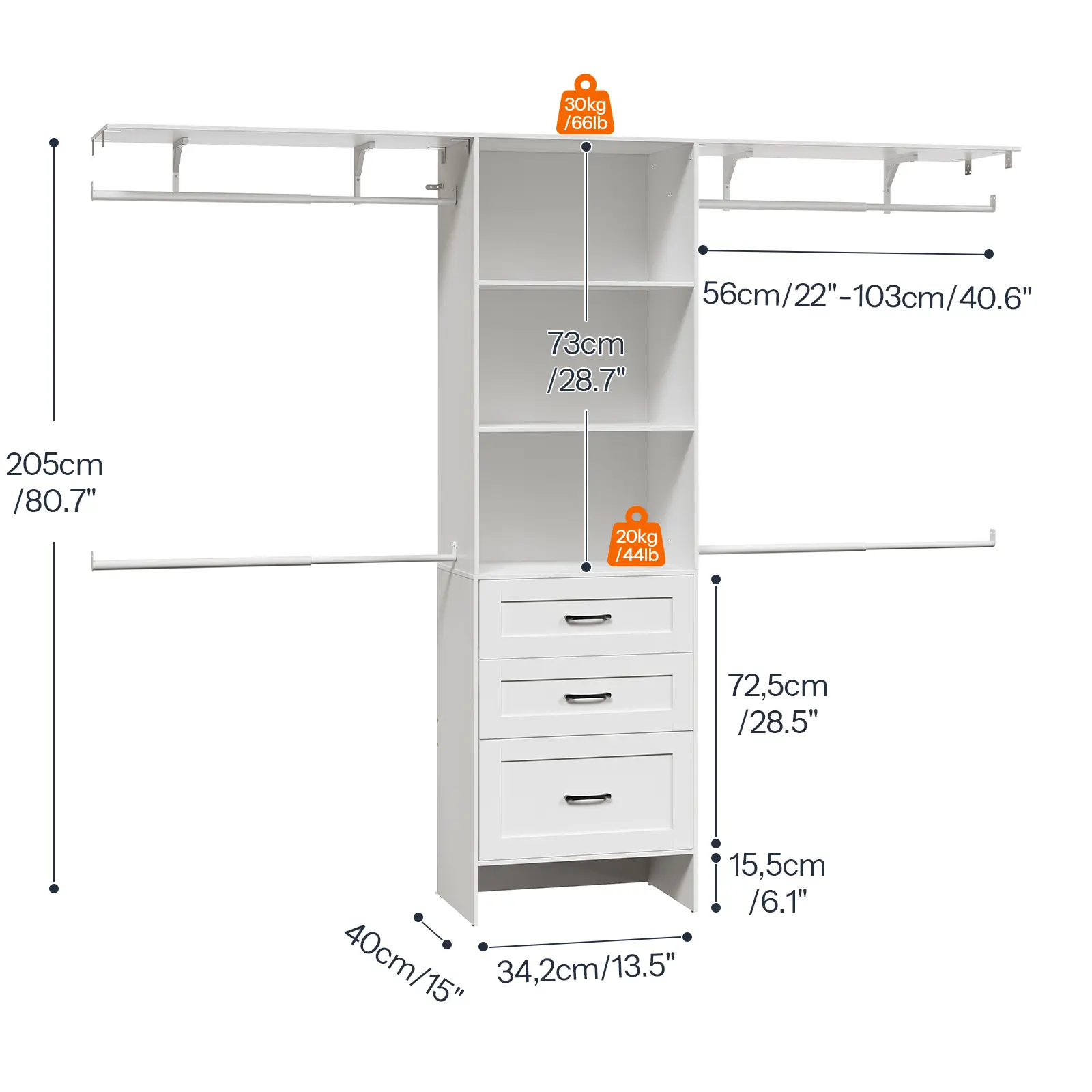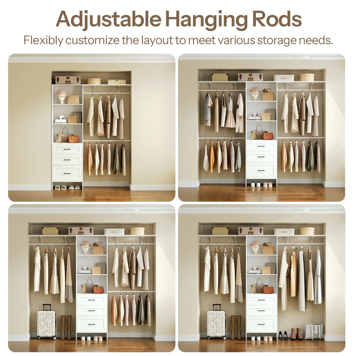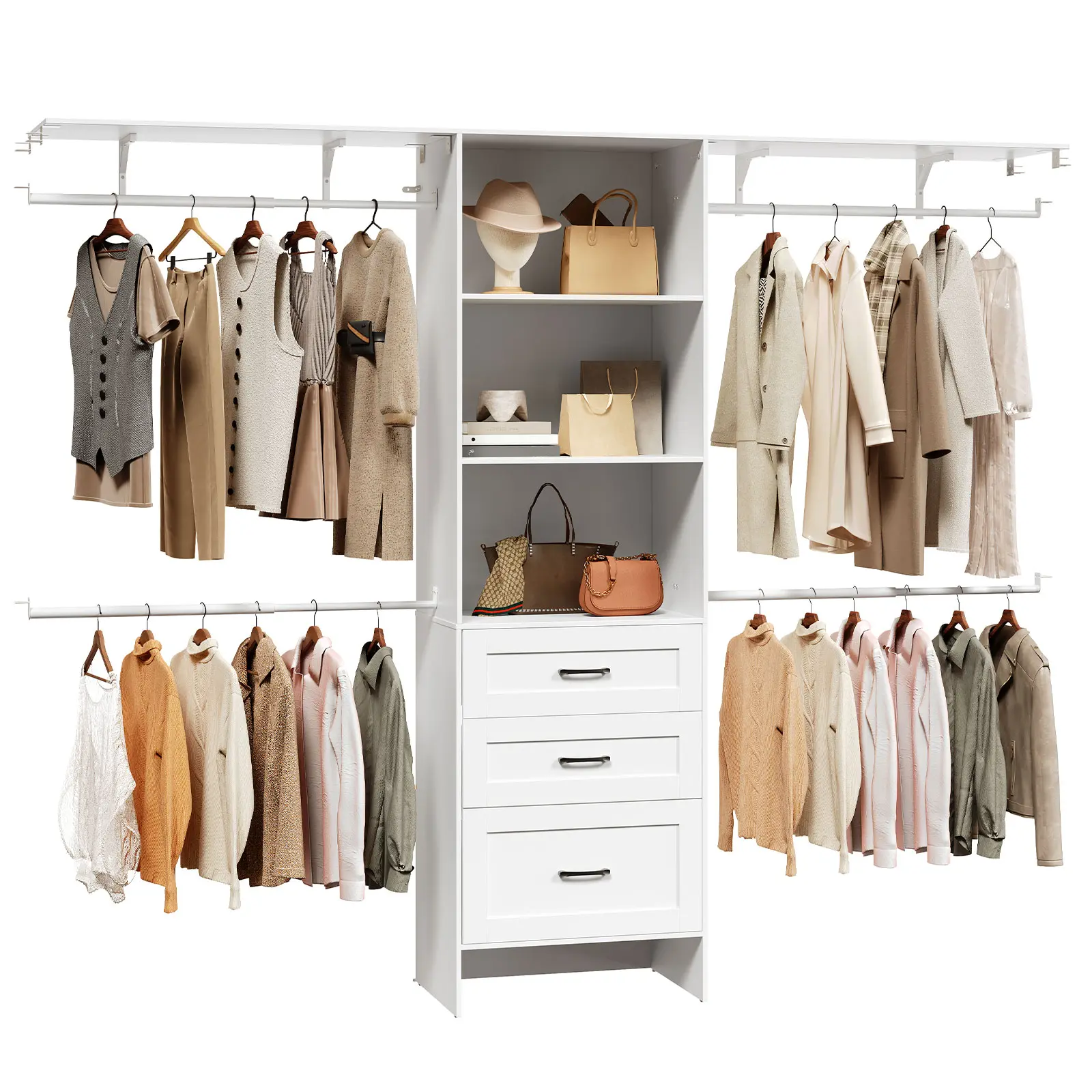 ·Versatile Storage: This closet system provides an efficient storage solution, organizing items with 4 extendable hanging rods, 3 independent drawers, and 2 removable open shelves, while its top shelf offers strong support for large items like luggage