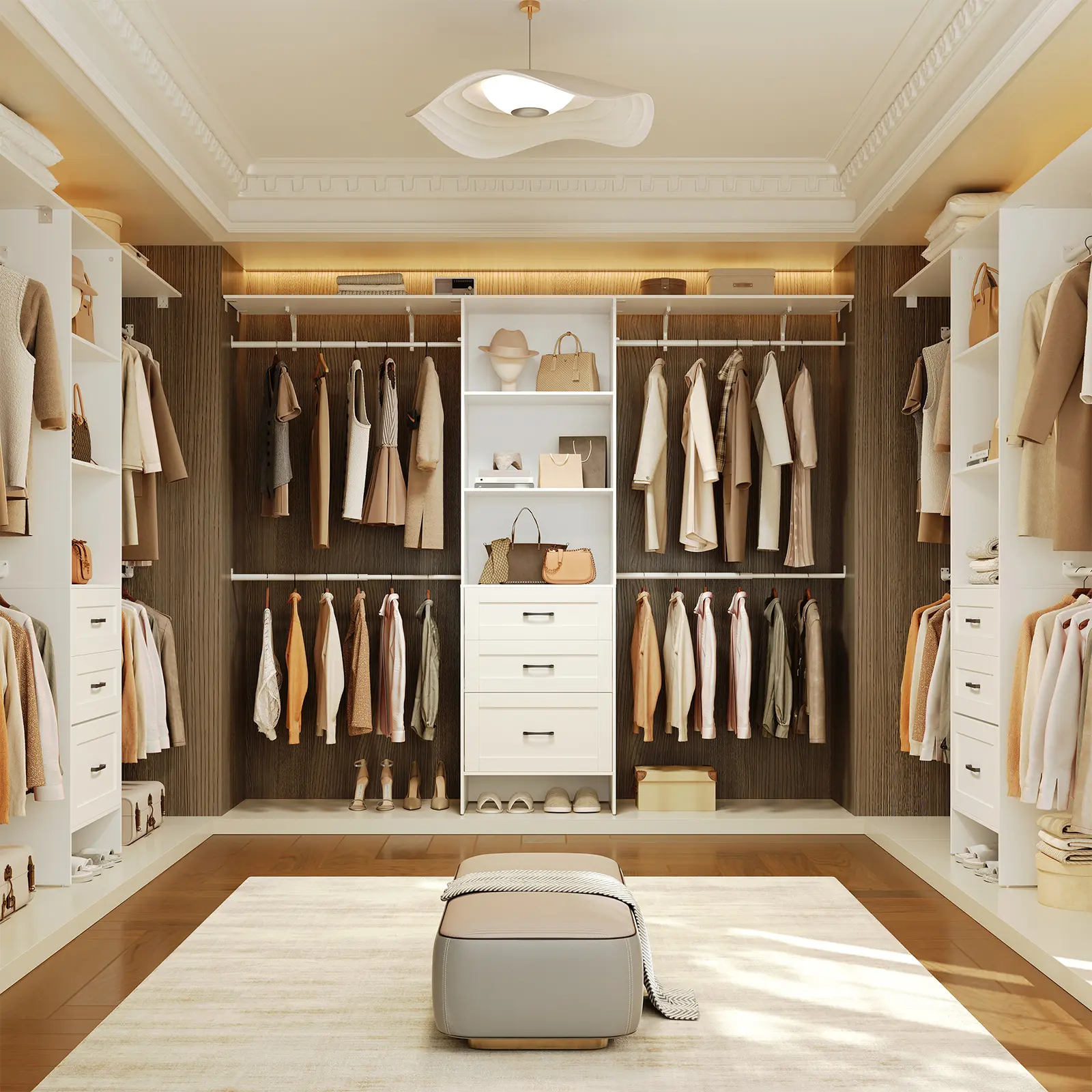·Flexible Layout: With its extendable hanging rods and detachable shelves, this walk-in closet system offers a flexible layout that can be customized to fit spaces from 5 to 8 ft wide, while the side rods extend from ** to ** inches for varied storage needs