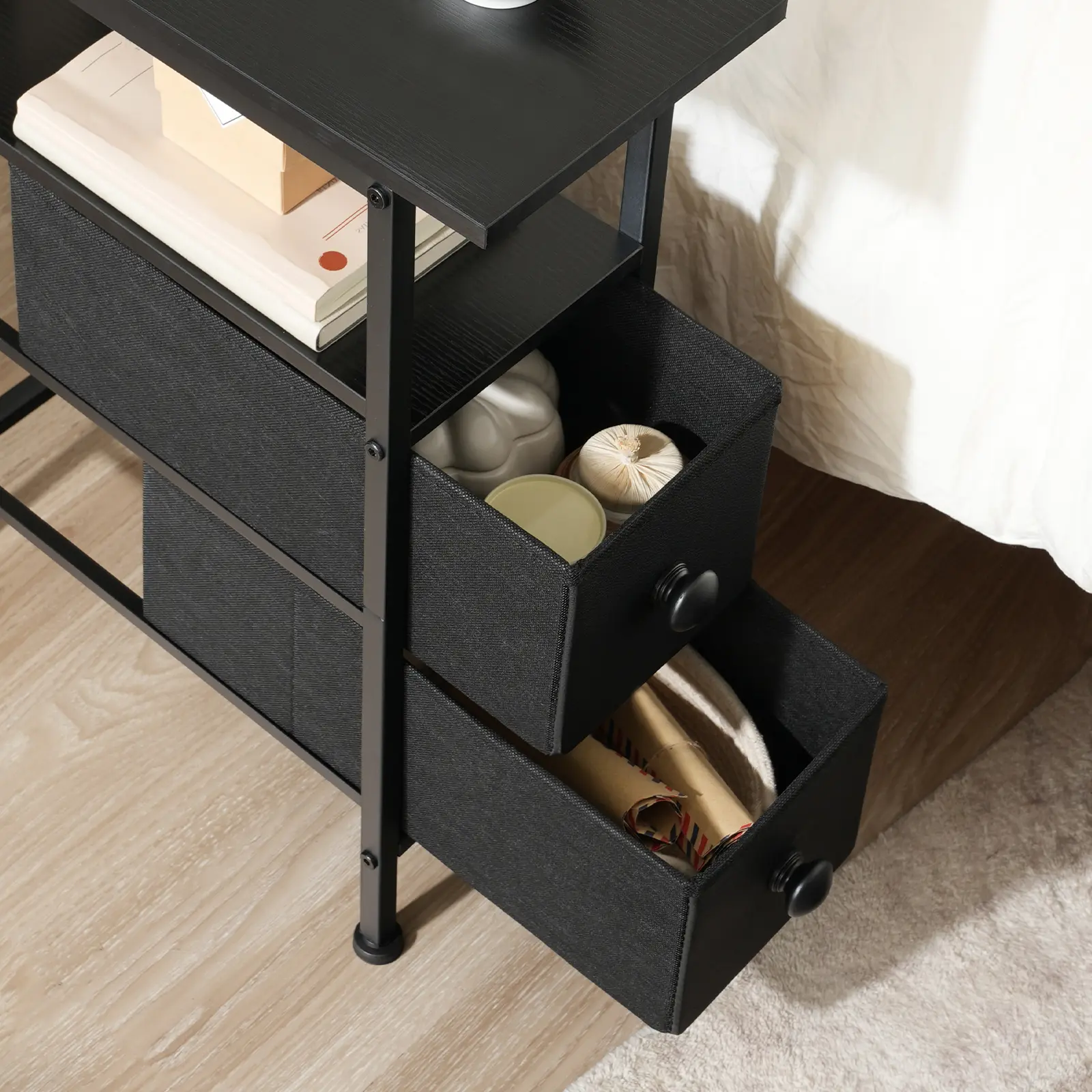 ·Open Shelves Meet Hidden Drawers: Showcase your favorite items on the open shelves while keeping personal belongings secure in the non-woven fabric drawers with this narrow side table, aesthetic and functional