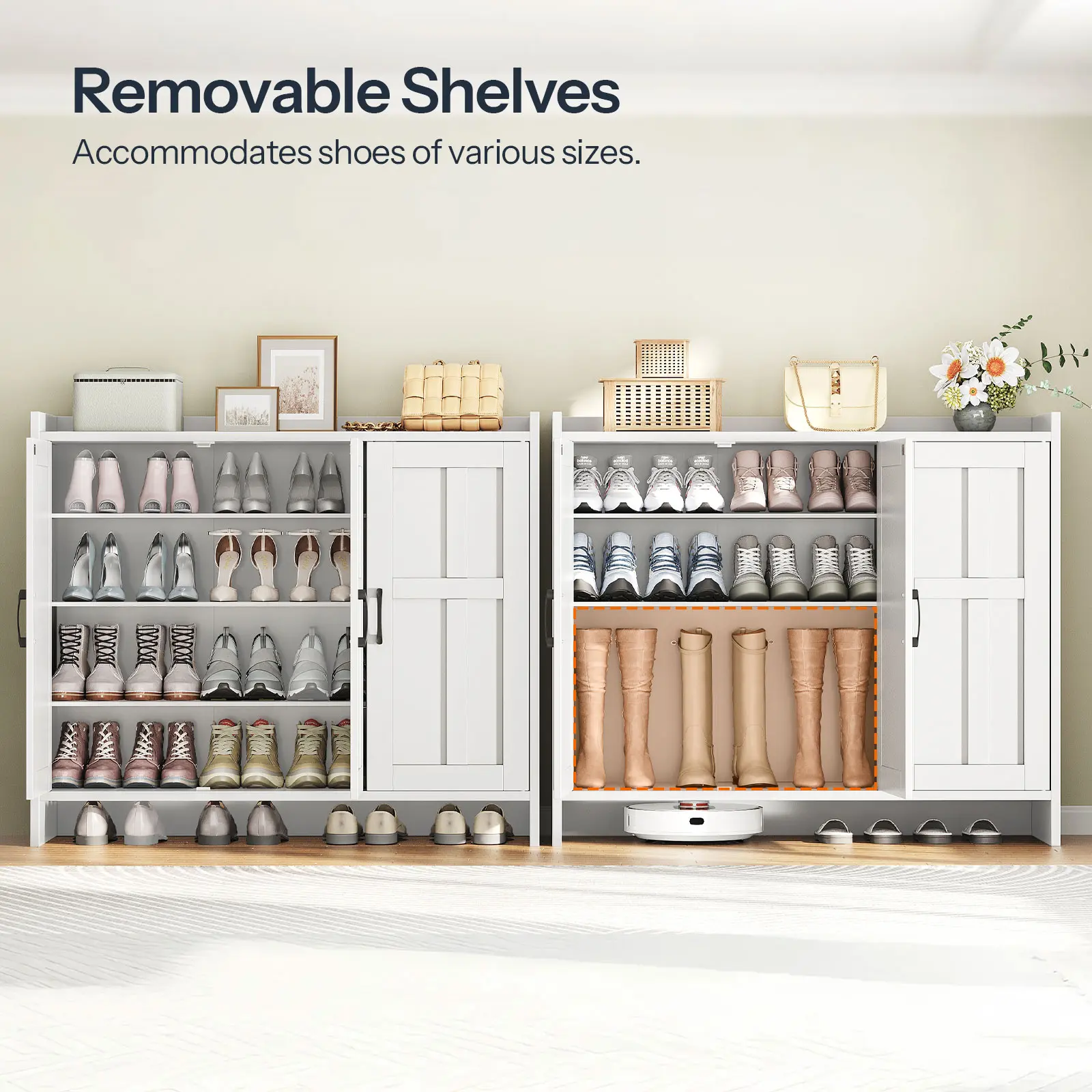 ·Adjustable Shelves for Flexible Storage: With multiple adjustable shelves, the shoe storage cabinet allows you to adjust to fit the heights of your footwear, from slippers and flats to boots and high heels, keeping your entryway neat and organized