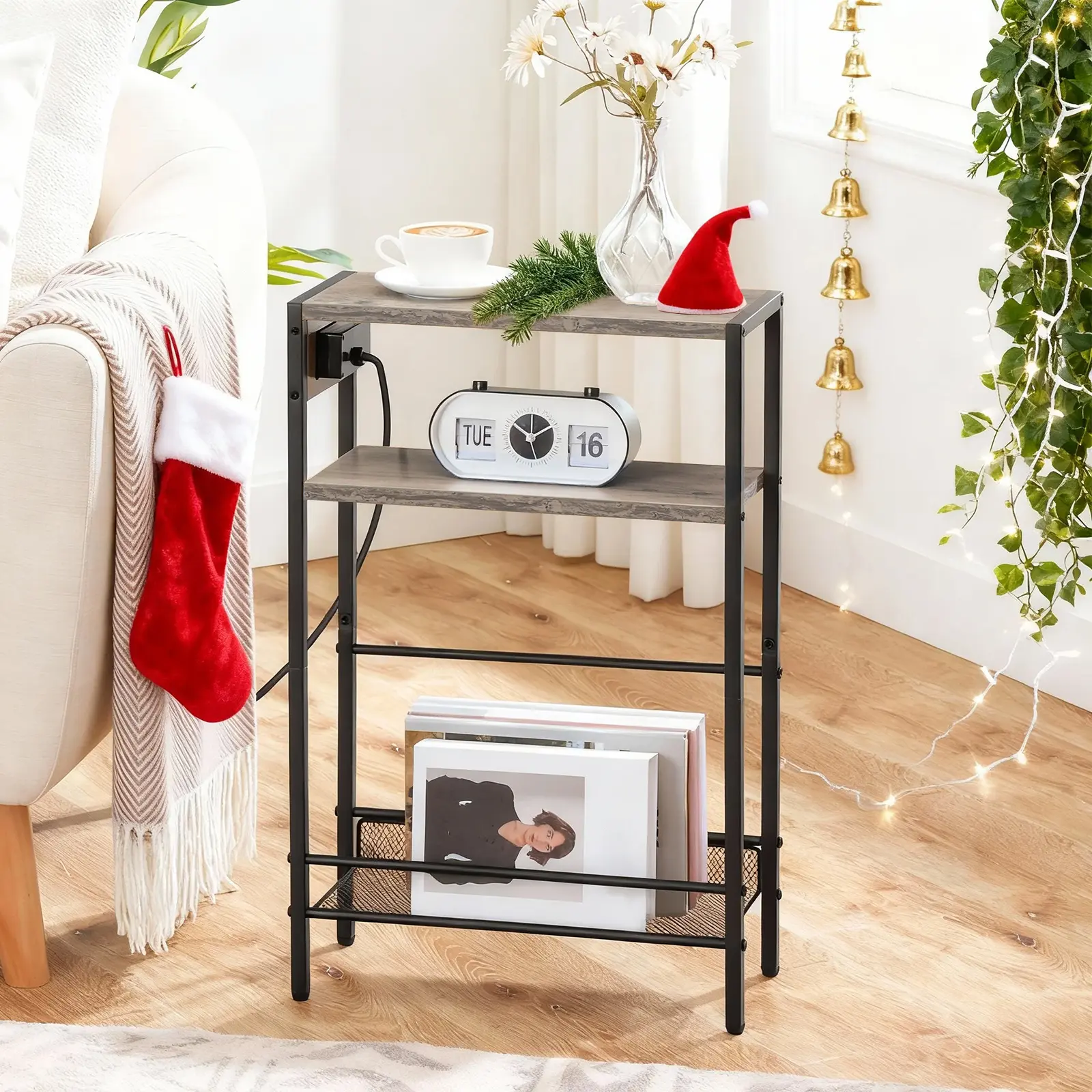 The HOOBRO Small Narrow Side Table with Charging Station is a versatile and practical piece of furniture designed for small spaces. With its power socket, adequate storage, slim design, easy assembly, and sturdy structure, it is a valuable addition to any home decor.
