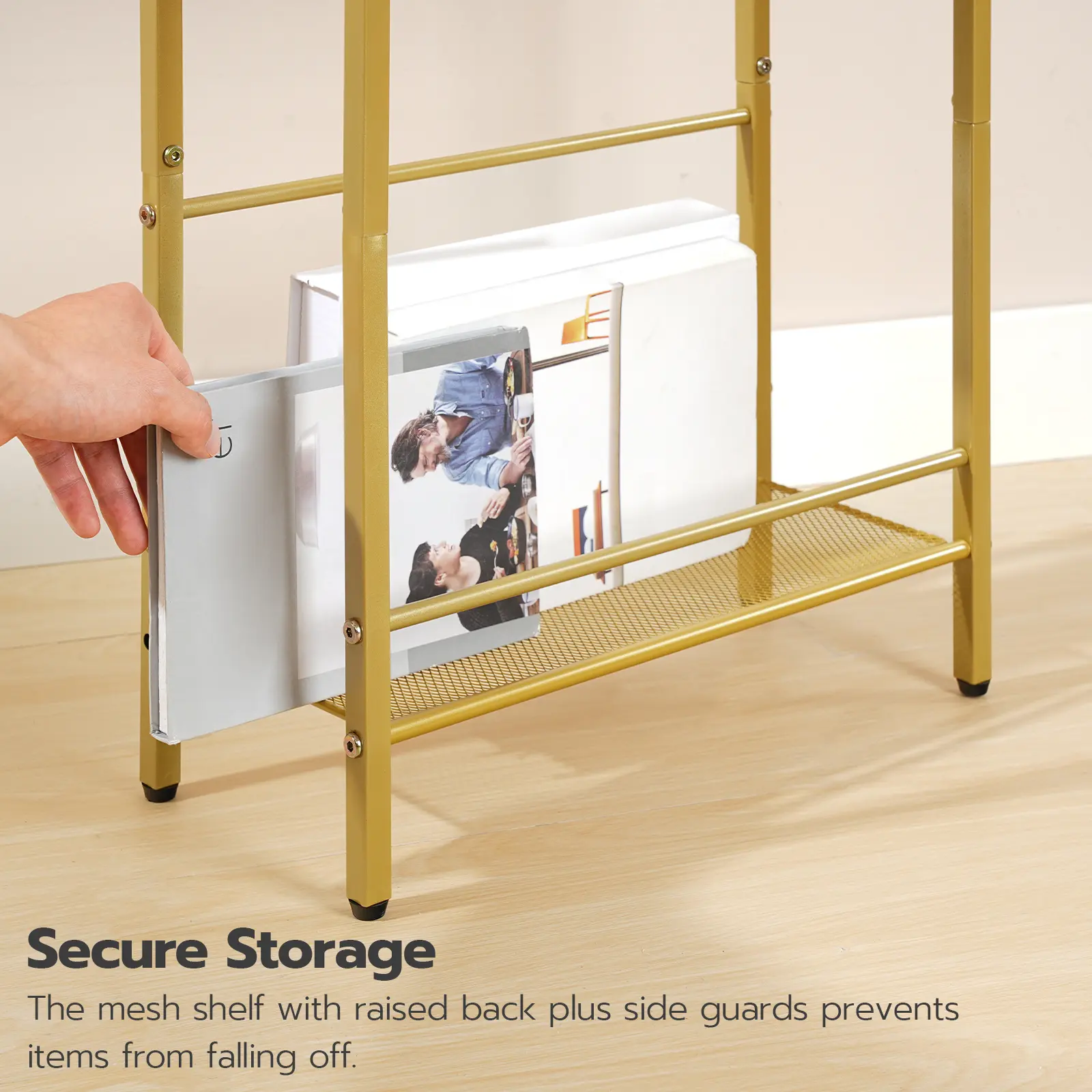 ·Adequate Space: 3 open shelves, with 2 wooden shelves for remote controls and glasses, and a bottom L-shaped mesh rack for magazines and books.