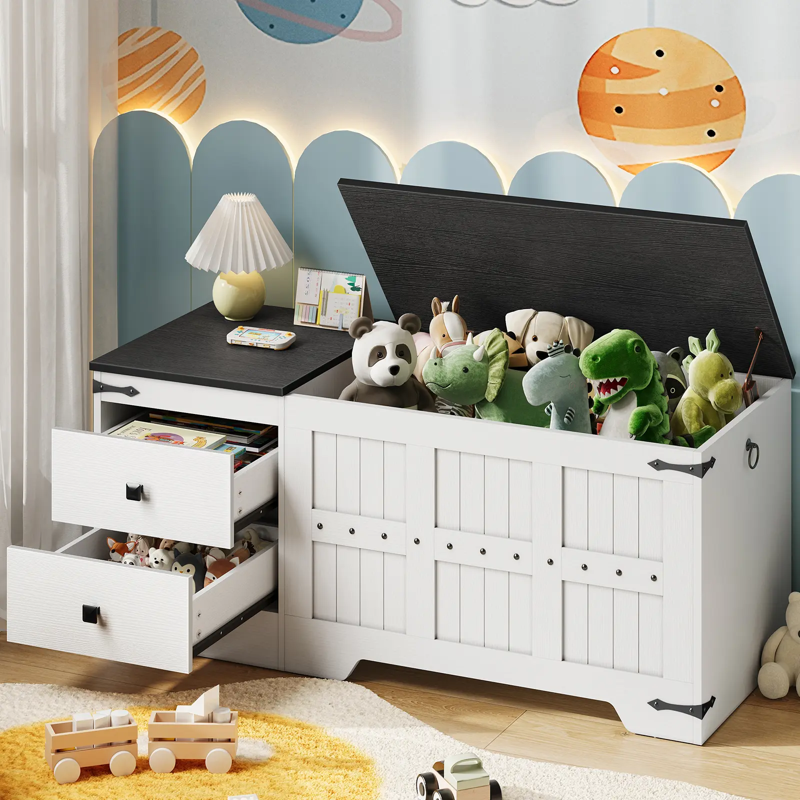 ·Versatile Usage as You Like: The thickened top boosts the overall stability of the storage unit and serves as an extra display or storage platform. Storage chest can even work as a small reading nook for kids, offering multiple functions and high practicality