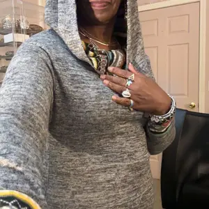I love this top. The colors and the detail on the hood and sleeves and side makes it pop. I love ,love, love the hood. Great fit.