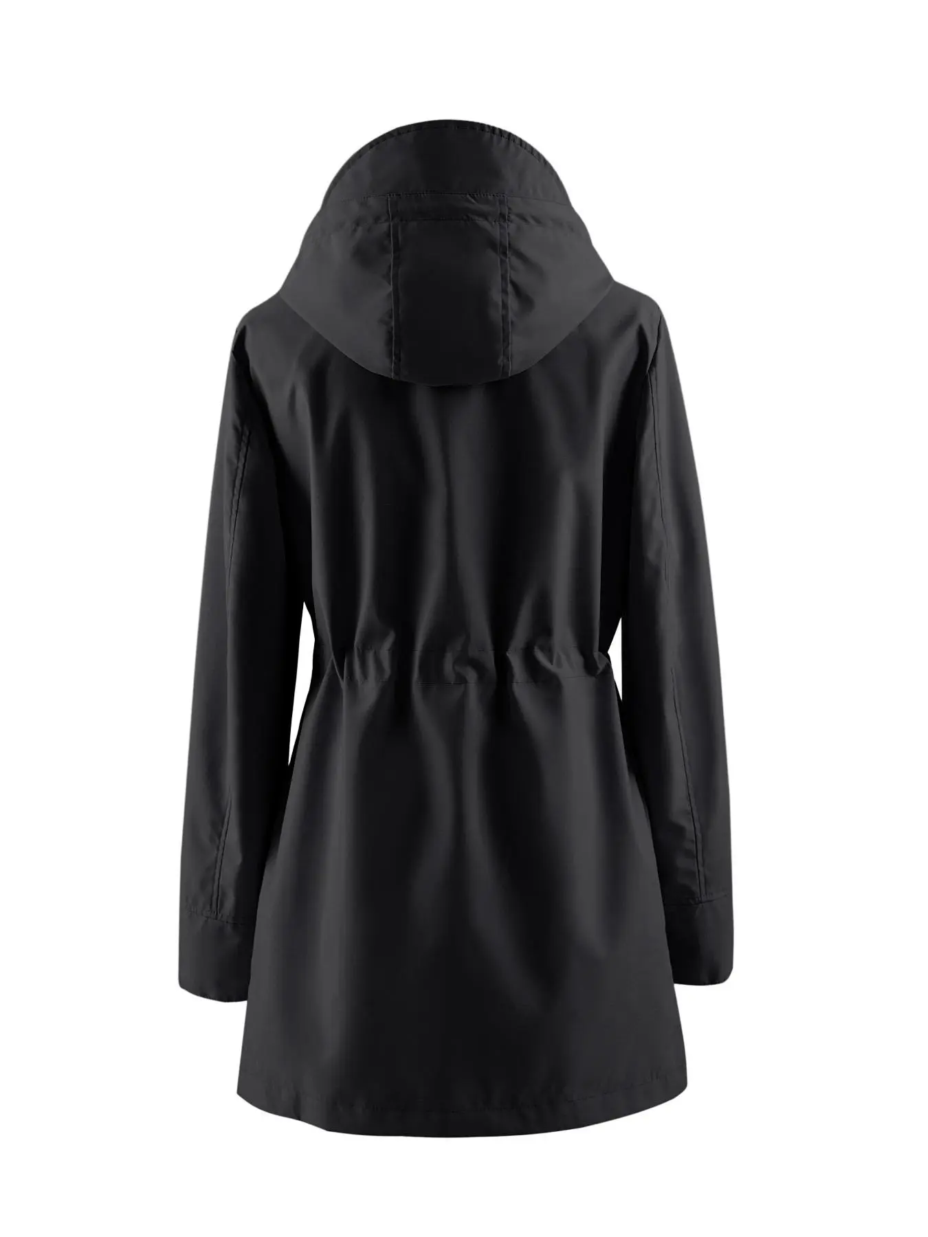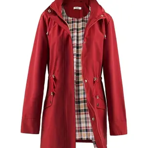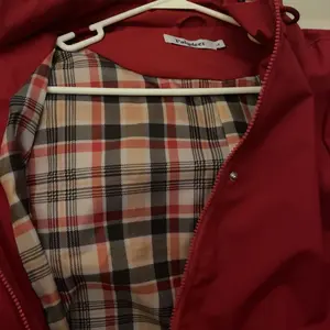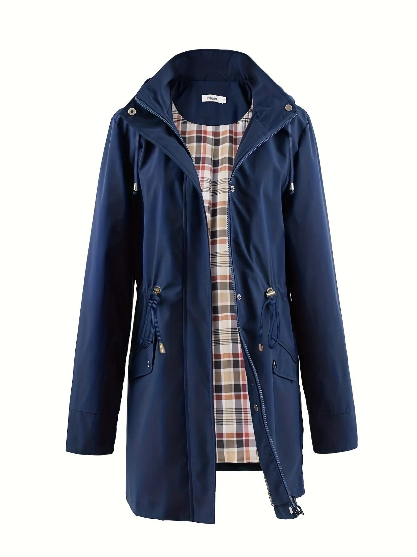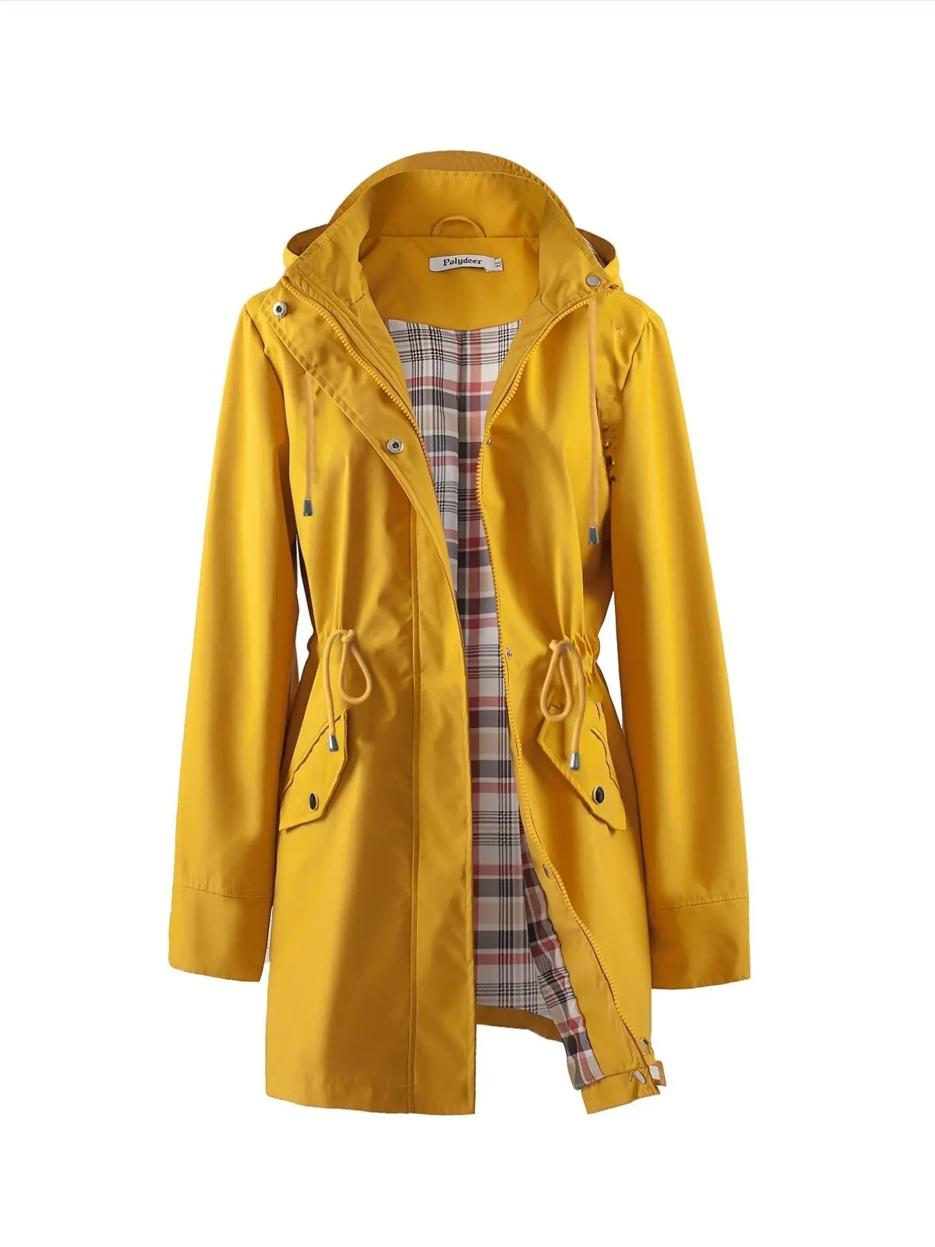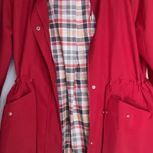 Super cute lightweight raincoat. Inside has a plaid lining that shows inside the hood and if you cuff the sleeves. I’m 5’3, 132 pounds and the medium has plenty of room to wear a sweater or sweat shirt under it. Drawstring cinches the waist giving it a well put together look! Love it