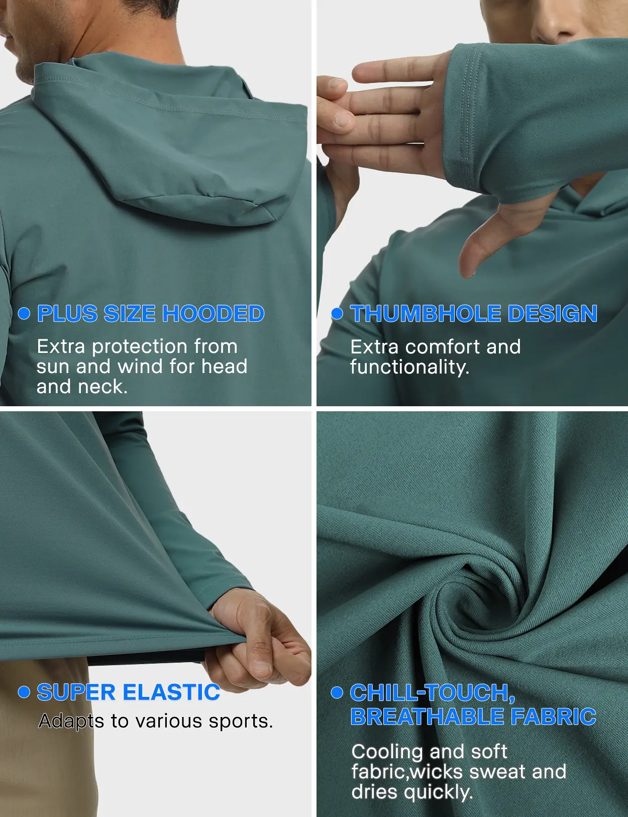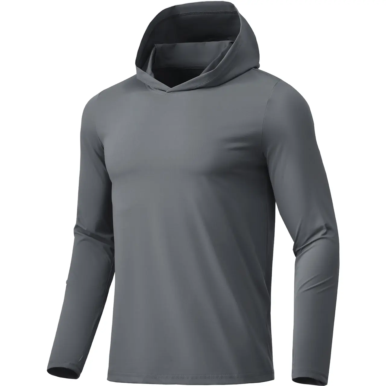 Hood & Thumbhole Design: The hooded design not only gives the men’s long-sleeve sun protection shirt a sleek and modern look but also adds practicality by shielding sensitive areas from UV rays, reducing the risk of sunburn. The thumbholes extend the sleeves over your palms, keeping them in place and providing full sun protection for your arms during outdoor activities.